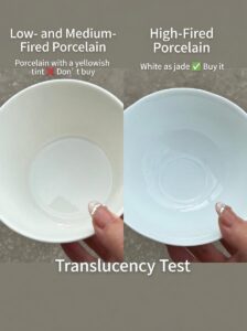 Low-fired porcelain is lighter, less dense, with a loose glaze. Poor-quality low-fired porcelain may even feel uneven or bumpy.