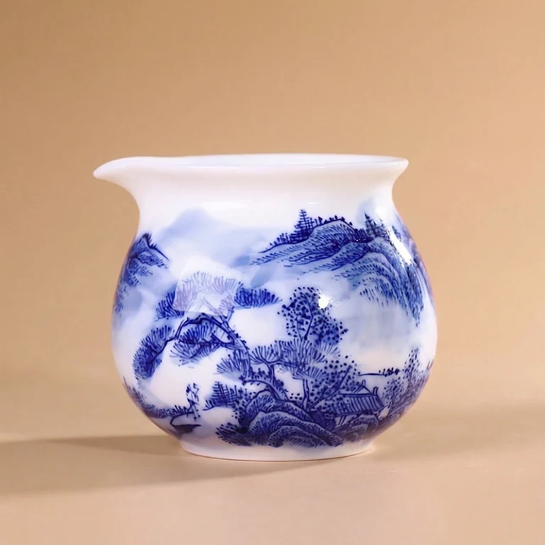 Hand-Painted Blue and White “Landscape Zen” Pitcher— Premium Kaolin Clay & Tea Justice Cup