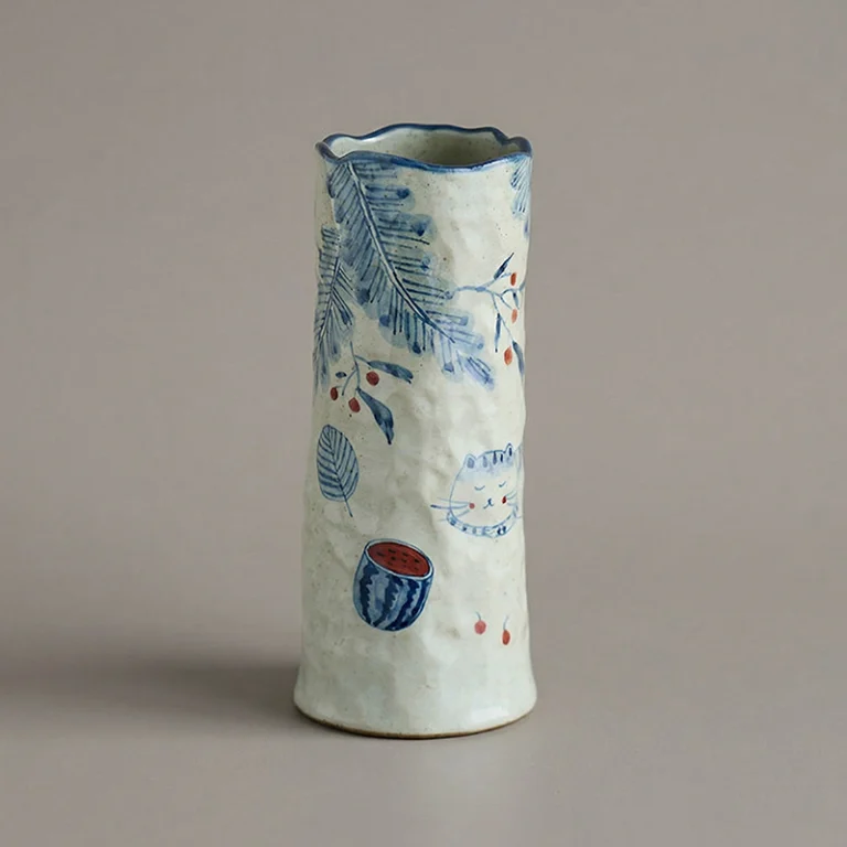 Hand-Painted Cat & Watermelon Blue and White Ceramic Vase