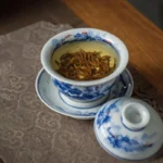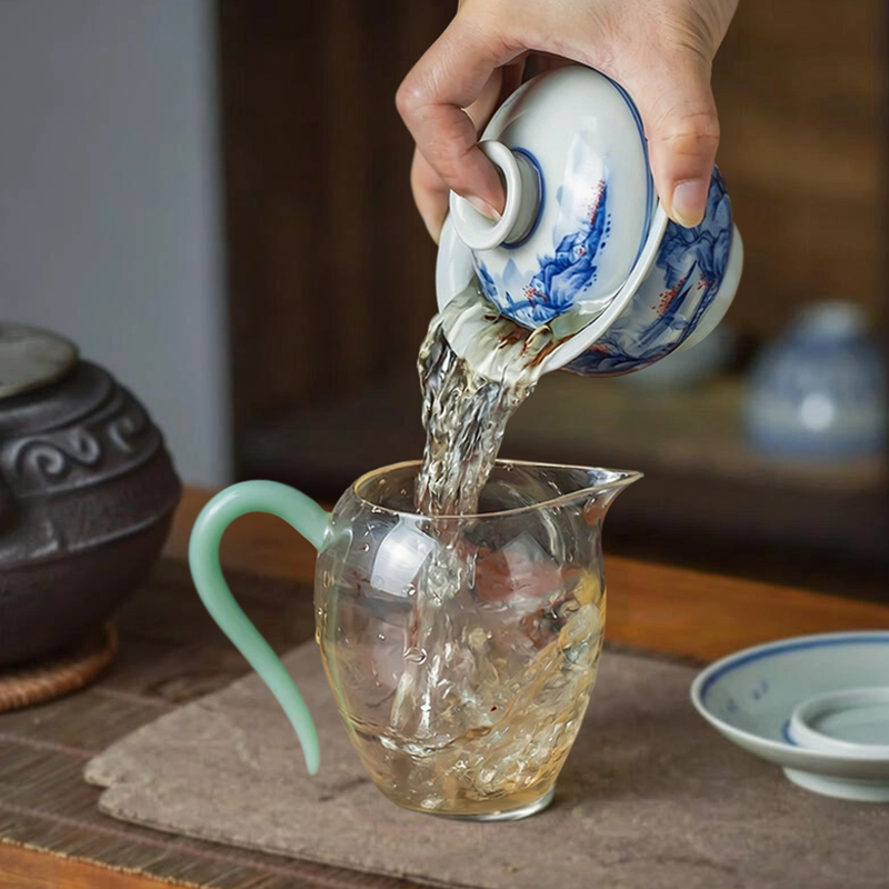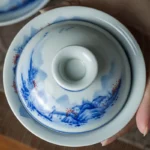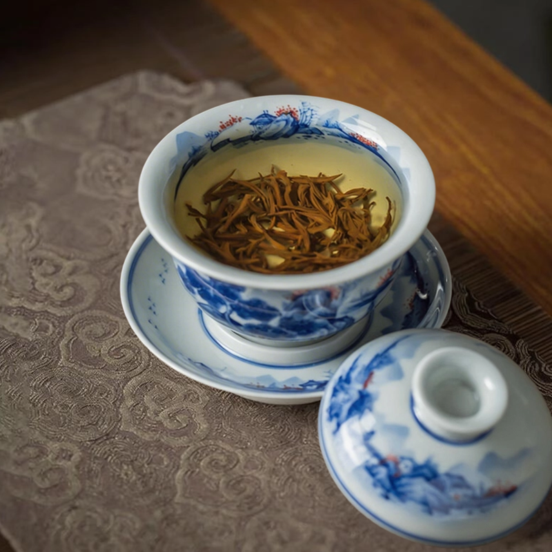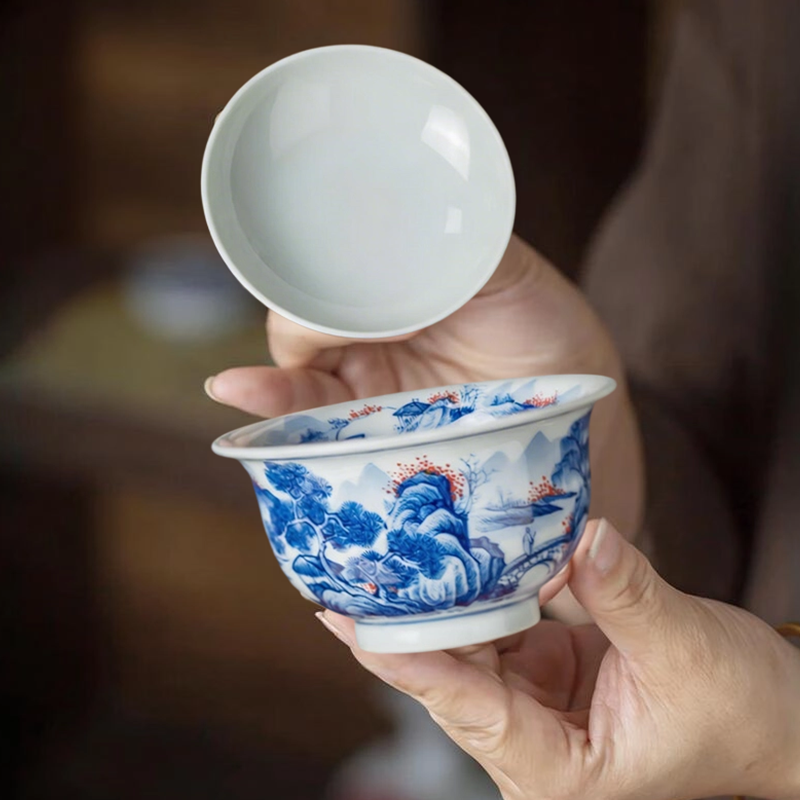 By artist Modu:This is a classic Yuanbao-shaped gaiwan, named for its rounded, ingot-like form that symbolizes prosperity and good fortune in Chinese culture. I shape every piece by hand, refining the curve of the bowl, the tight fit of the lid, and the stability of the saucer until it sits perfectly in the hand, pouring smoothly without dripping. The clay is premium high-white kaolin, refined for days to create a luminous, translucent body that glows softly when held to light—this is the clean, elegant texture that defines Jingdezhen’s finest porcelain.This gaiwan uses the underglaze blue and red technique, one of the rarest and most difficult crafts in Jingdezhen porcelain. Unlike standard underglaze blue, this technique uses two mineral pigments: cobalt for the blue mountains, pines, and figures, and copper red for the vibrant red blossoms. The two pigments have extremely different firing temperature requirements—even a 5-degree difference in the kiln can ruin the red pigment, turning it black or burning it away entirely. For centuries, even imperial kilns struggled to produce perfect underglaze red pieces, making this craft a true test of an artisan’s skill. Every line of the misty mountains, every needle of pine, every dot of red on the blossoms, every detail of the scholar walking by the stream, is painted freehand with a fine brush, no stencils, no shortcuts. Fired at over 1300℃, the pigments fuse permanently with the clear glaze, so the colors will never fade