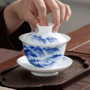 A 150ml handcrafted Yuanbao-shaped gaiwan from Jingdezhen, featuring a serene pine-and-stream landscape painted with traditional underglaze blue and red technique.
