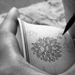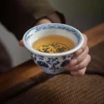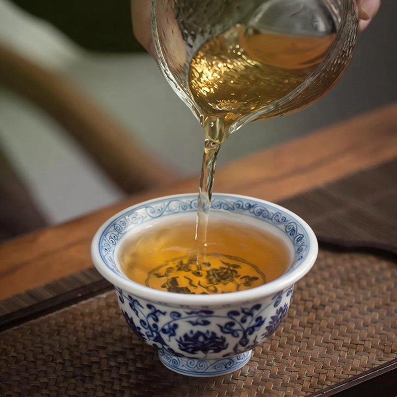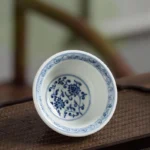 By artist Modu:This is the legendary Ya Shou Bei (Pressure Hand Cup), first created in the Yongle imperial kilns. Its thickened rim and weighted base sit perfectly in the palm, giving a gentle, reassuring pressure when held—hence its name. I shape every cup by hand, refining the curve of the body and the stability of the foot to match the exact proportions of the original imperial pieces. The clay is a traditional antique formula, fired at over 1300℃ to create a warm, muted luster that echoes the imperial porcelain of the Ming Dynasty. This cup uses the rare Sumali blue pigment, brought back from the Islamic world by Zheng He’s voyages during the Yongle era. This low-manganese, high-iron pigment fires into a deep, vivid blue with a subtle violet undertone when held to light—like a sapphire, rare and precious. Every petal of the interlocking lotus, every vine, and every border line is painted freehand with this precious pigment, a technique that has been passed down for over 600 years. Fired at high temperature, the blue fuses permanently with the glaze, never fading or chipping.