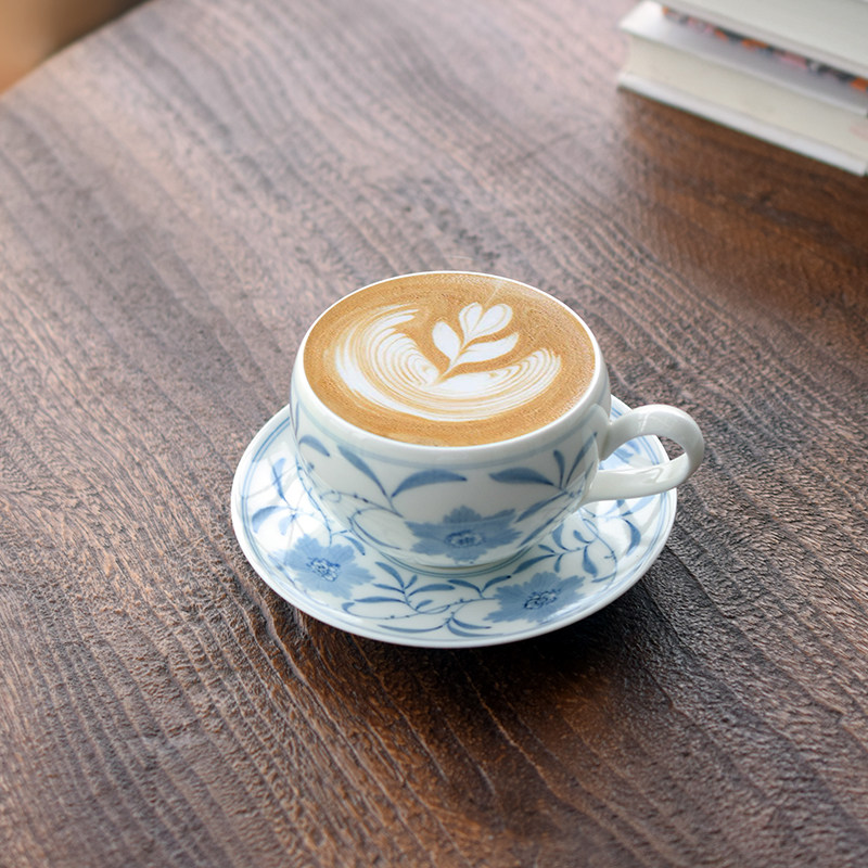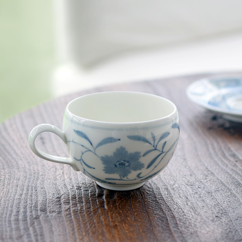 Warm high-white porcelain with hand-painted blue & white vine patterns, rounded shape for cozy grip. 260ml capacity ideal for lattes and American coffee—elegant, fresh Eastern vintage handmade ware.