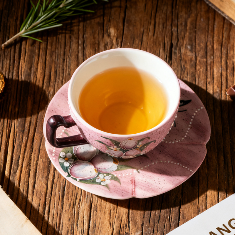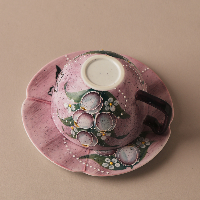By artis kai:Blush purple base with hand-painted tulips, gold-rimmed petals + butterfly saucer, 250ml capacity, gentle healing handmade cup & saucer set.Dark brown rounded handle, comfortable and non-slip grip; the saucer has a wavy edge + butterfly pattern, matching the tulips on the cup, a healing decor piece anywhere.