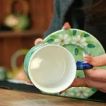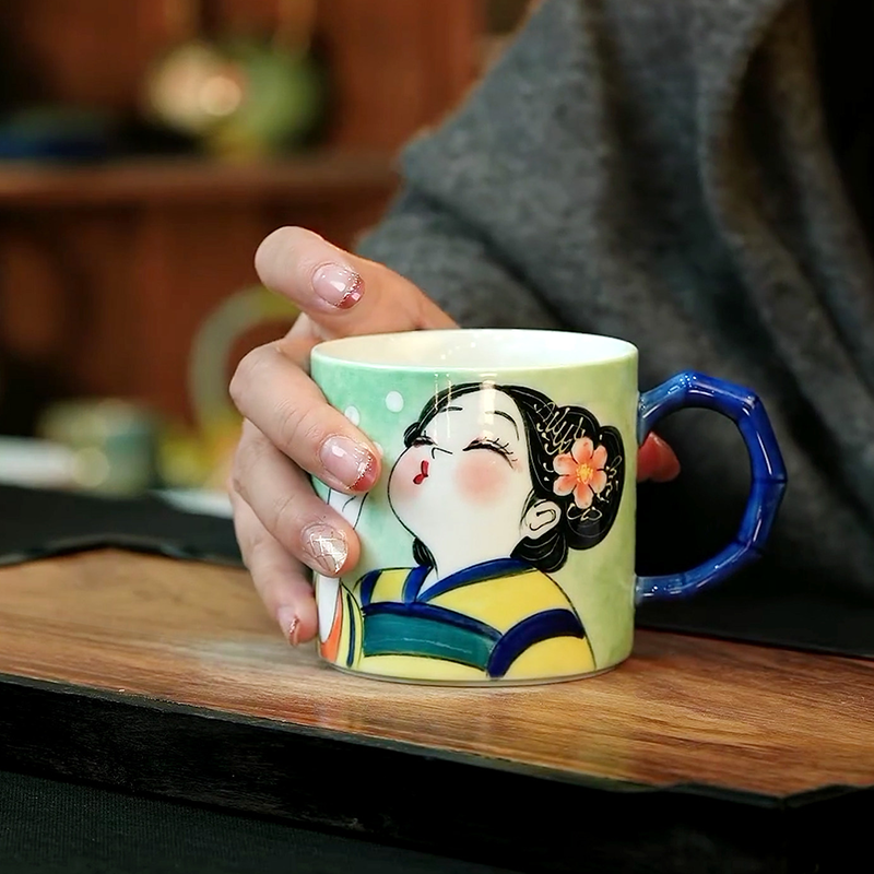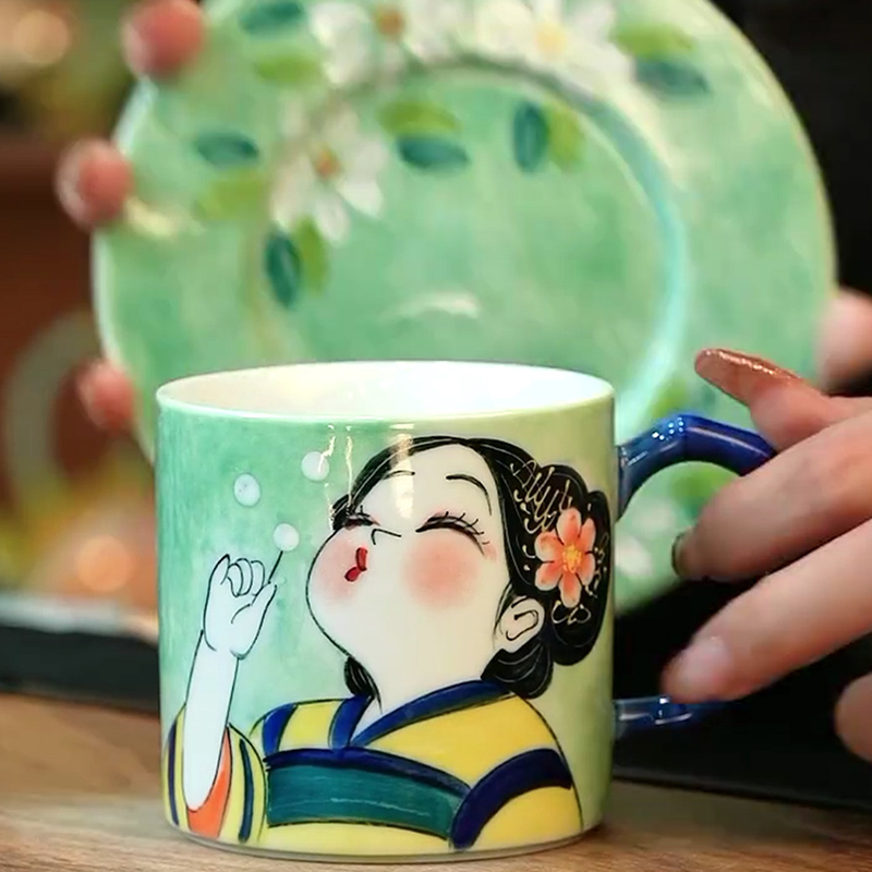 By artis Celia:The girl uses hand-painted underglaze craft, with round and cute lines—pink cheeks, squinted eyes, and bubble-blowing action full of playfulness. High-fire firing locks colors permanently beneath the glaze, ensuring no fading. Every expression and bubble is hand-done by me—no two sets are identical.The saucer is hand-painted with daisies and leaves, echoing the energetic girl on the cup. The handle has a bamboo-joint blue glaze shape, both beautiful and non-slip. The 300ml capacity holds a latte or milk tea perfectly, ideal for daily use and table decor.
