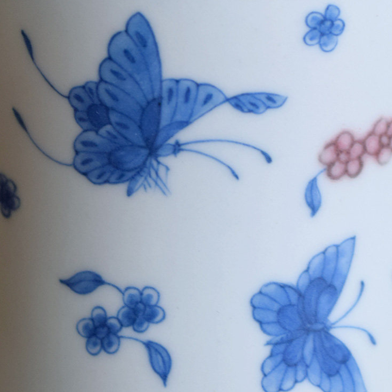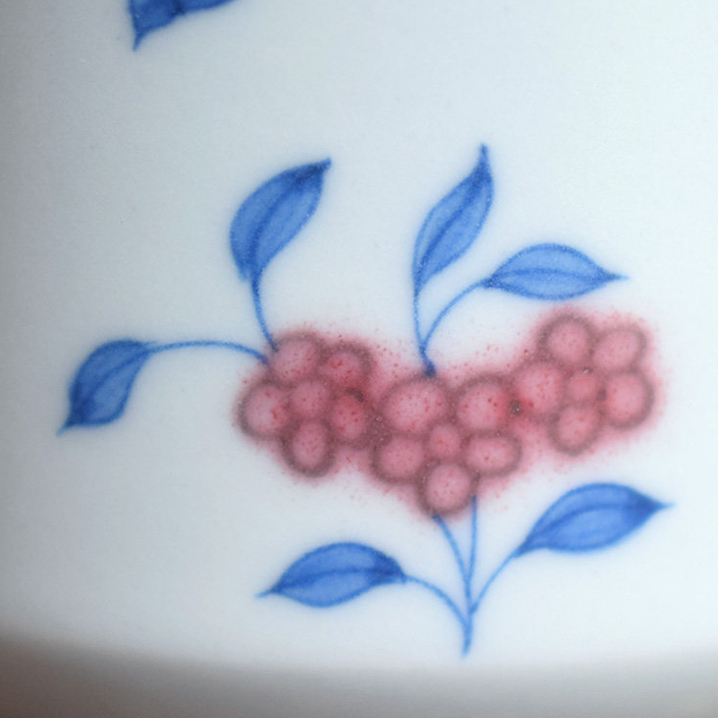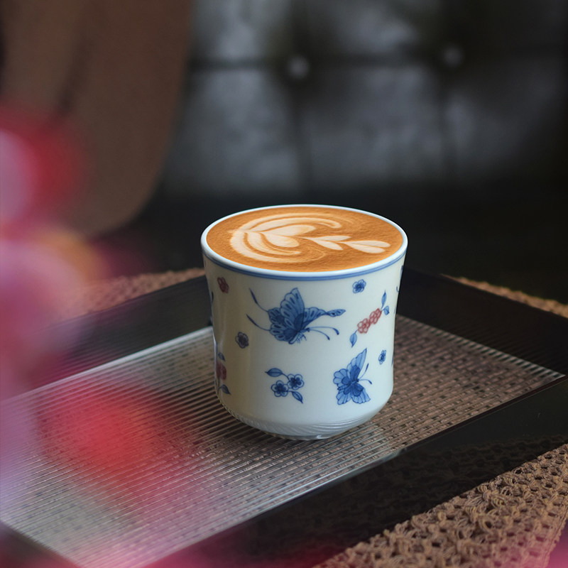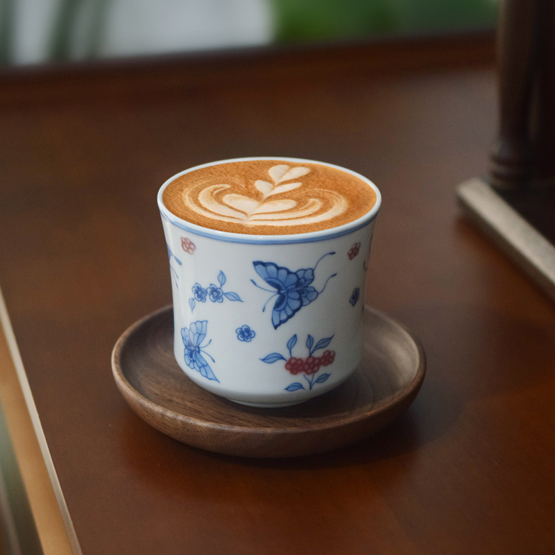High-white porcelain base with hand-painted blue-and-white copper-red craft. Butterflies dancing among flowers and red berry motifs complement each other. 250ml capacity ideal for lattes and pour-over coffee.