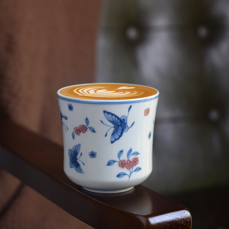 Butterfly Loves Flower Hand-Painted Blue-and-White Copper-Red Coffee Cup