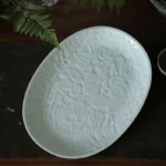 By artis Modu:The small plate measures 23×17×2cm, with an oval shape that fits comfortably in hand. It is suitable for serving snacks, fruits, or as a tea plate or decorative plate, combining daily use and aesthetic appreciation.This plate is inspired by the lush foliage growing freely in spring—every leaf vein and branch direction is hand-carved by me. The relief texture under the celadon glaze is layered in light, as if sealing the vitality and gentleness of the forest into the porcelain
