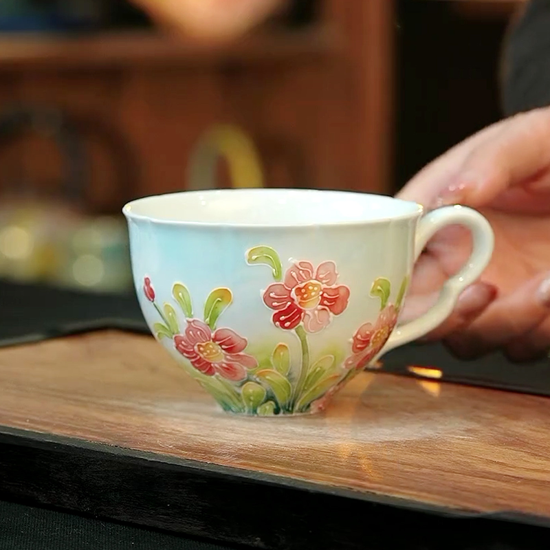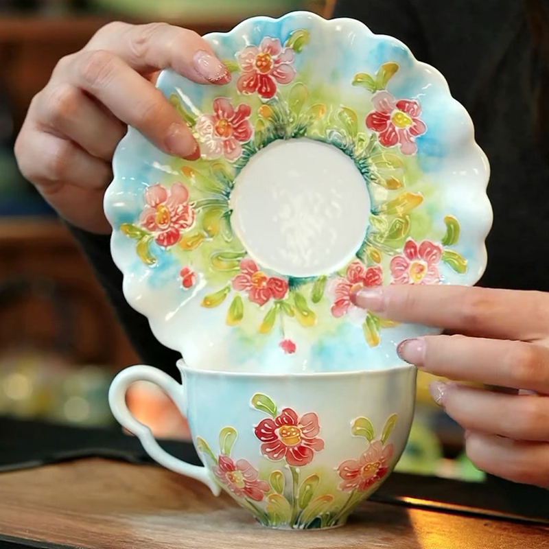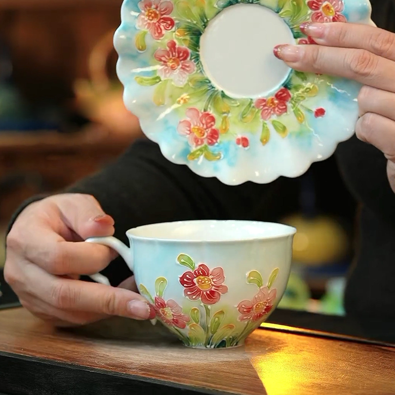 By artis Celia:This set was inspired by a spring stroll in Jiangnan water towns—daffodils bloomed above clear ripples, pink petals trembling in the breeze, etching the grace of “water immortals” into time.I used a soft blue-green base, painted plump daffodil petals with 3D stacking on the cup, and echoed the same pattern on the saucer, etching “spring ripples” into the porcelain. I hope whoever holds it can feel the tenderness of “tucking Jiangnan into your arms” in a cup of coffee.May you remember those fresh moments when holding it, knowing that life is always full of tenderness.