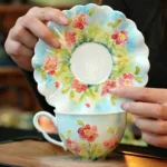 Soft blue-green gradient high-white porcelain with 3D hand-painted red daffodil blossoms, ruffled wavy saucer edge. 220ml capacity ideal for coffee and tea—original handcrafted ware full of spring freshness and Eastern poetry.