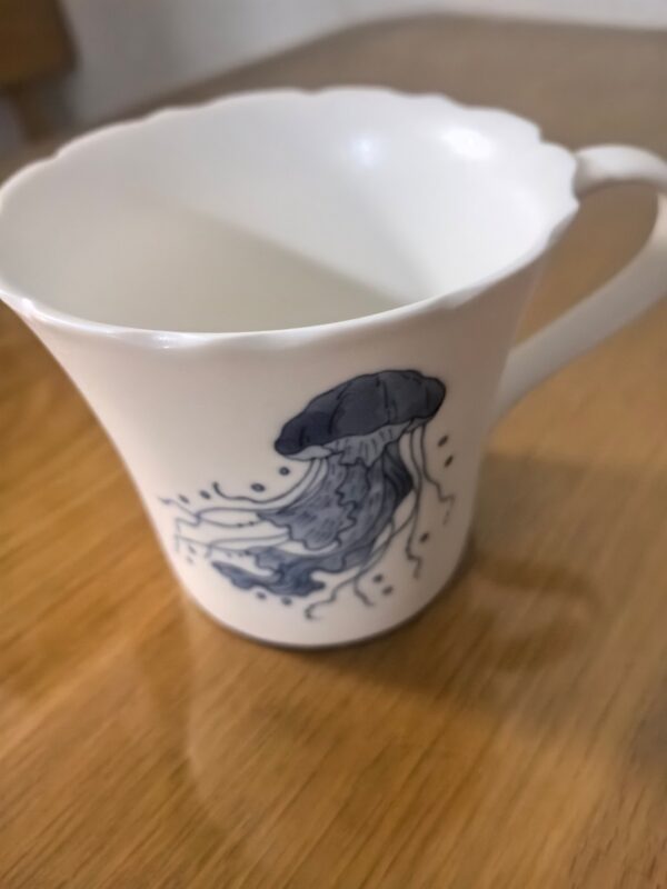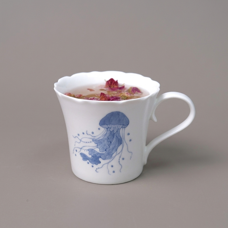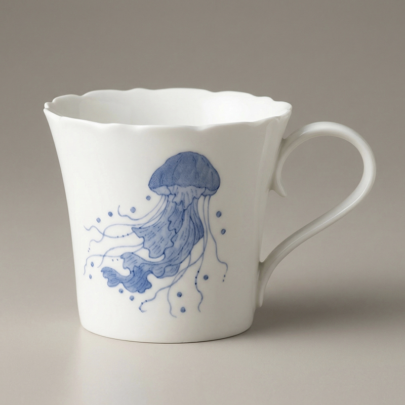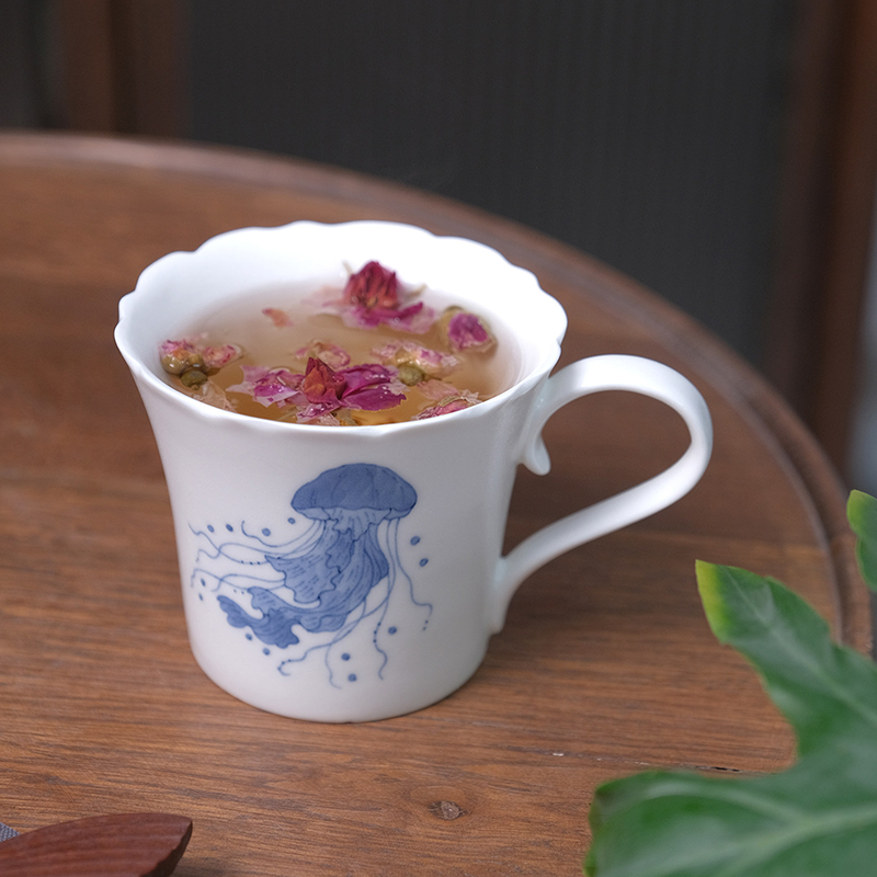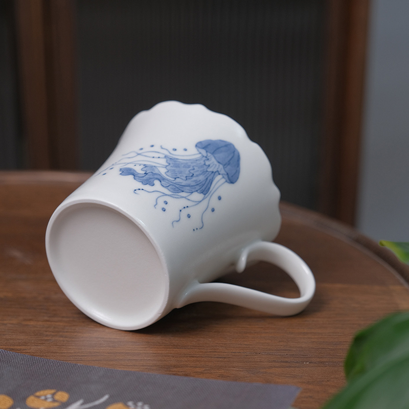 High-white porcelain base with hand-painted indigo jellyfish, wavy rim design. 350ml large capacity ideal for coffee and tea, durable and easy to clean with high-fire underglaze technique—hold the gentleness and freedom of the deep sea in your hand.