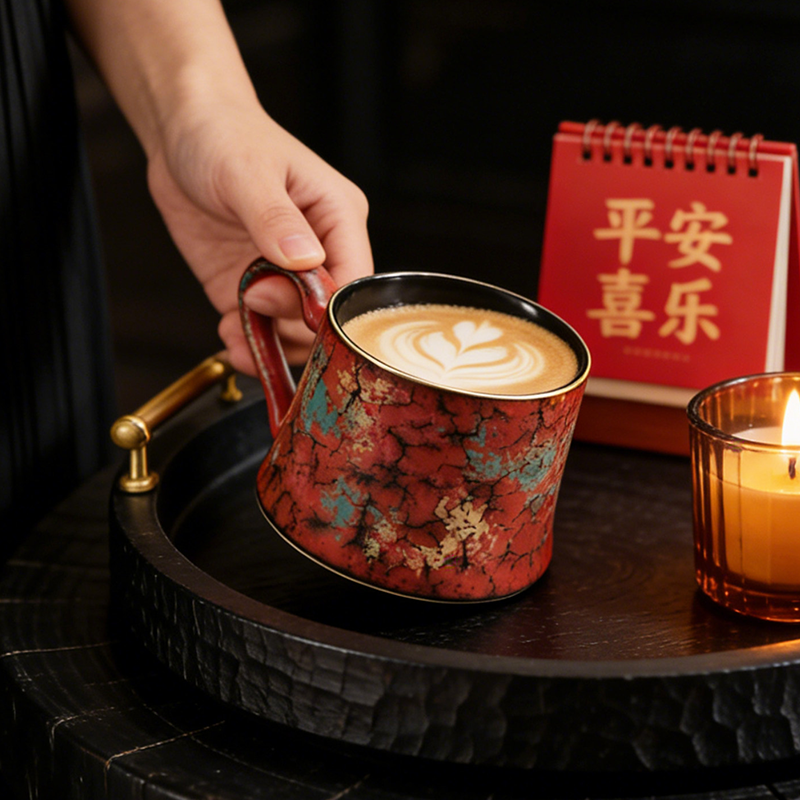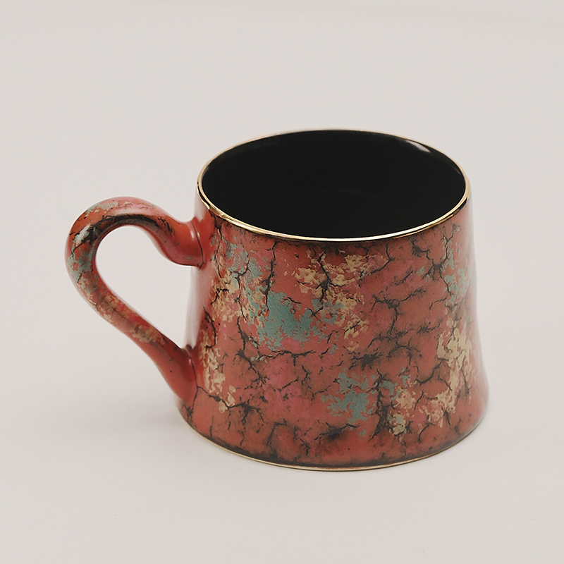 By artis kai:This mug was inspired by cinnabar and gold leaf in Dunhuang murals—the red base is like a desert sunset, the crackle glaze is like time-carved patterns, with lapis lazuli and gold powder accents, sealing “the romance of a thousand-year Dunhuang” into the clay!Irregular waist-cinching shape + rounded handle, comfortable and non-slip grip. 300ml large capacity holds a perfect large latte or Americano, suitable for daily commuting and office use.