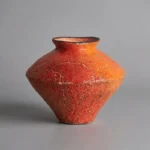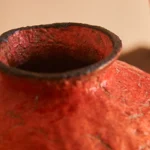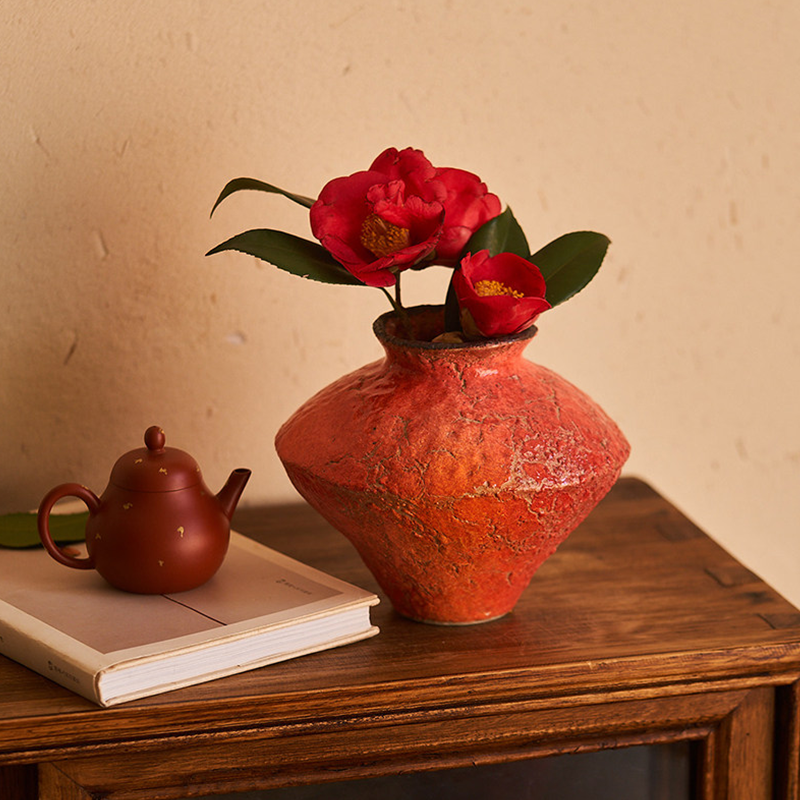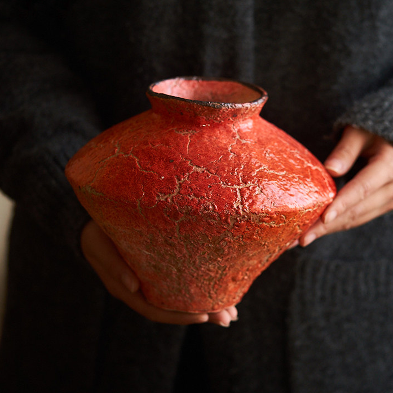 By artist Meiji:I hammered the clay while it was still soft, leaving deep cracks and rough ridges across the surface. It’s not smooth, it’s not polished—it’s alive. Run your palm over it, and you’ll feel the grit of the earth, the heat of the kiln, the weight of time. The glaze seeps into those cracks, turning deep crimson at the center to burnt orange at the edges, like the sun bleeding into a desert canyon at the end of the day.We didn’t make this to be “charming.” We made it to be a reminder: beauty doesn’t have to be soft or perfect. Sometimes, the most powerful things are the rough, cracked, sun-baked ones—the ones that have been through fire and still stand tall.
