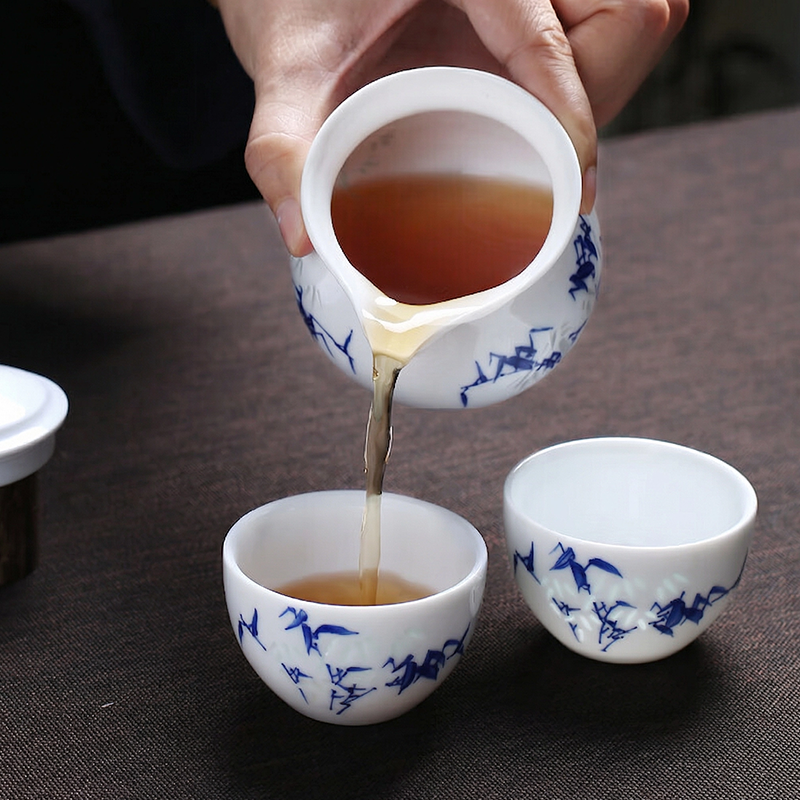 A handcrafted fairness pitcher from Jingdezhen, combining the rare “linglong carving” (pierced openwork) technique with underglaze blue bamboo painting. Light shines through the delicate carved gaps, creating a luminous, translucent effect.