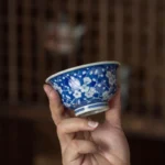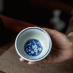 By artist Modu:Ya Shou Bei, or “pressure hand cup”, is a legendary tea vessel first created in the imperial kilns of China’s Ming Dynasty (Yongle period, 15th century). It is revered as the “king of tea cups” for its perfect ergonomic design: when held in the palm, the thickened rim sits steadily against the fingers, giving a gentle, reassuring weight that fits perfectly in the hand, hence the name “pressure hand”. I shape every cup by hand, refining the curve of the body, the thickness of the rim, and the height of the foot until it delivers the perfect balance and feel for tea sipping. The clay is premium antique formula kaolin, paired with traditional antique glaze, fired at over 1300℃ to create a warm, muted luster that echoes the charm of ancient porcelain.I use the traditional underglaze blue technique to paint the classic ice plum blossom motif, a signature design of Qing Dynasty Kangxi period blue and white porcelain. The deep cobalt blue background mimics the cracked texture of ice, with delicate white plum blossoms blooming across the surface. In Eastern culture, the plum blossom is the symbol of unyielding integrity, noble character, and hope— it blooms bravely in the cold of winter, defying the frost
