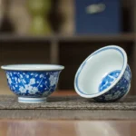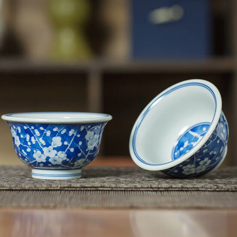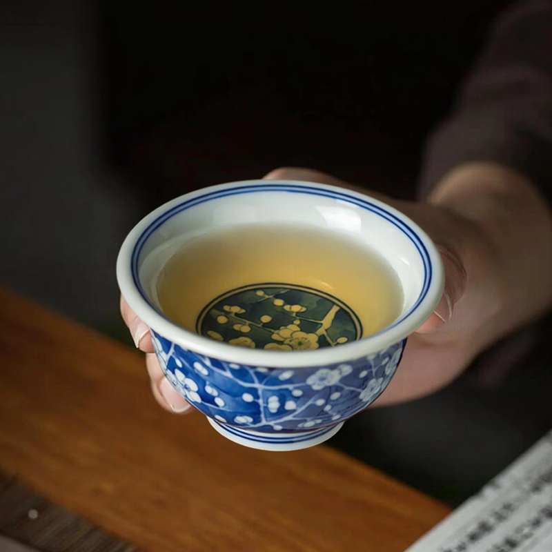 A 100ml handcrafted antique-style pressure hand tea cup from Jingdezhen. Hand-painted with the classic ice plum blossom motif on premium antique clay and glaze, fired at high temperature