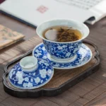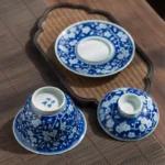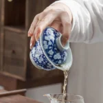 The greatest challenge in crafting this Gaiwan lies in “Fen-shui” (Water-grading). That vast expanse of deep blue is not a simple flat wash. We artisans must use a specialized brush, relying on the strength and precision of our wrists to control the pigment’s concentration. We “grade” the cobalt stroke by stroke to achieve a depth resembling a sapphire, all while accurately preserving the pristine white of the blossoms. It is a manual mastery that takes decades to stabilize.
