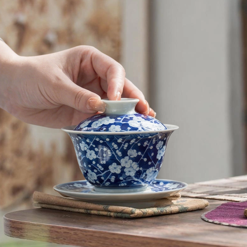 Hand-Painted Blue and White “Bing-Mei” Antique Style Yuan-Bao Gaiwan
