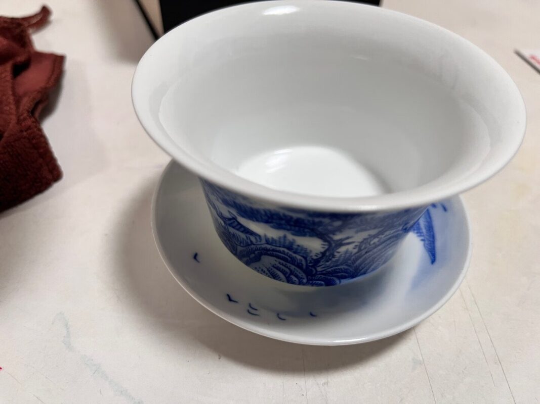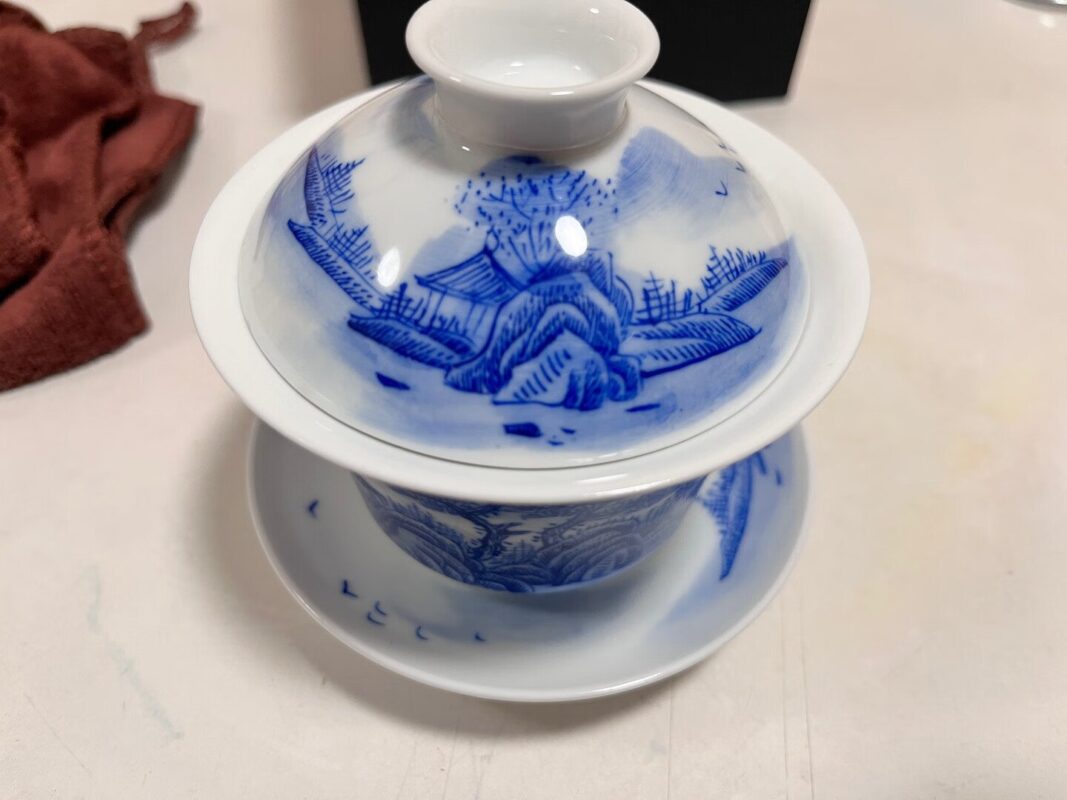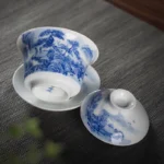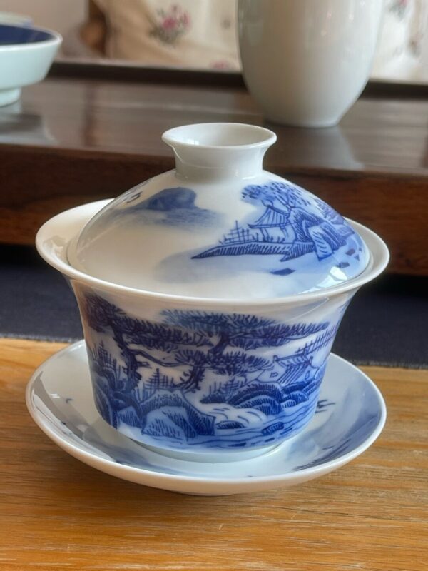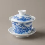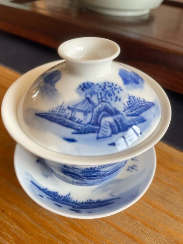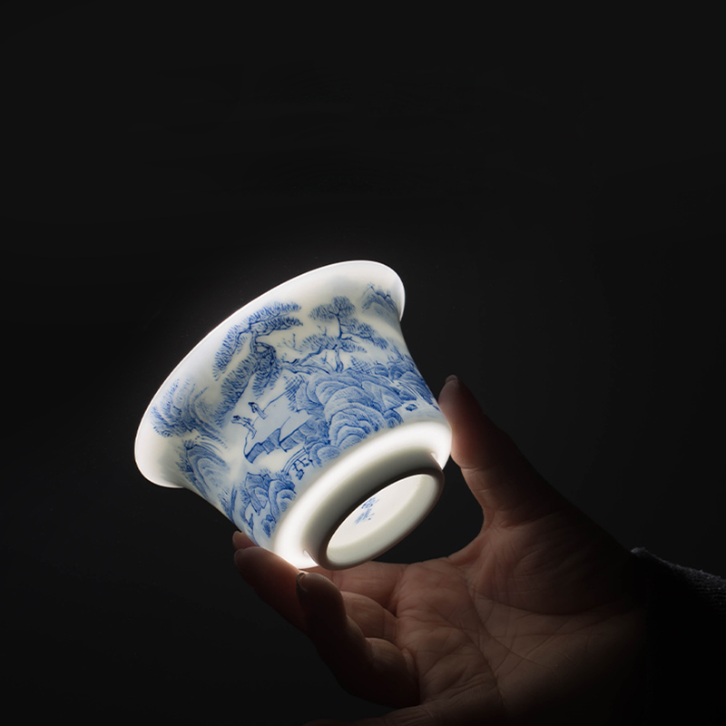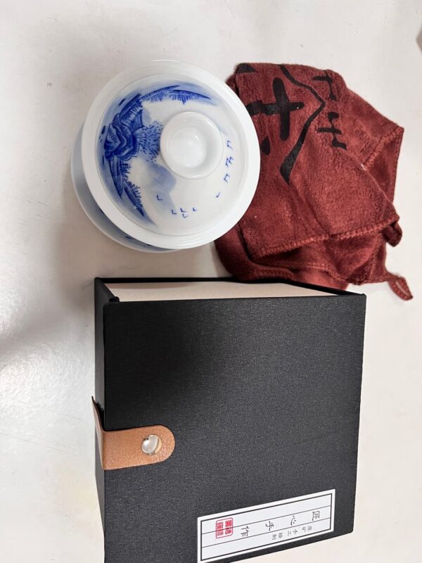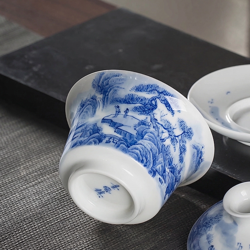 Painting this Gaiwan is a grueling test of skill. It is “heavy-work,” requiring mastery of Blue and White “water-grading” (Fen-shui). The varying depths of the mountains and the intentional “blank space” of the mists are meticulously achieved by controlling the concentration of cobalt on the brush tip. It’s not just a painting; it’s the embodiment of the literati spirit.