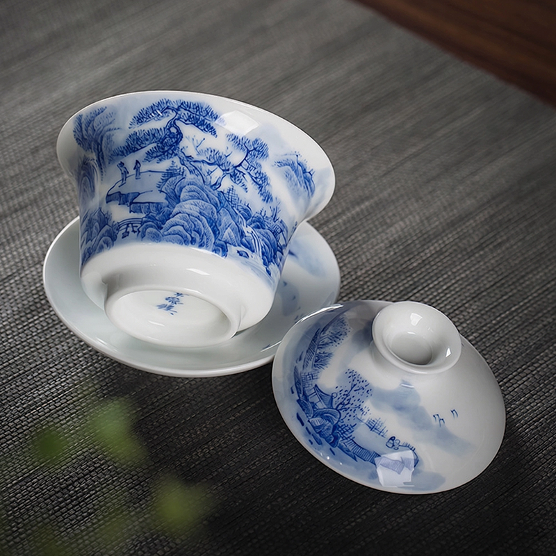 Hand-Painted Blue and White “Imperial Landscapes” Heavy-Work Horseshoe 3-piece gaiwan set