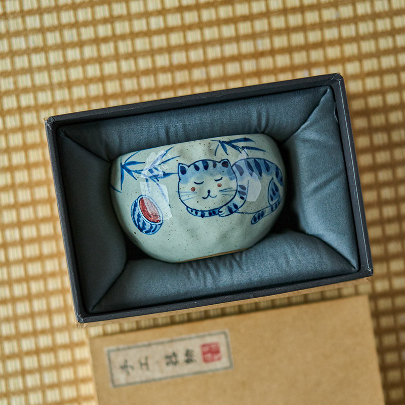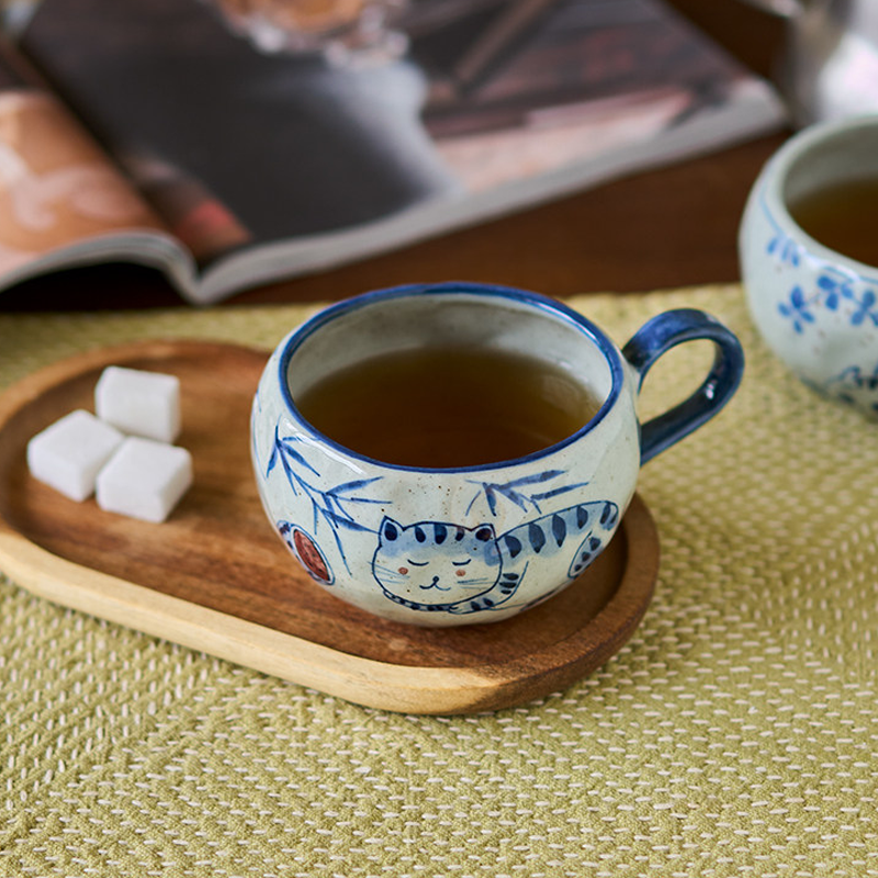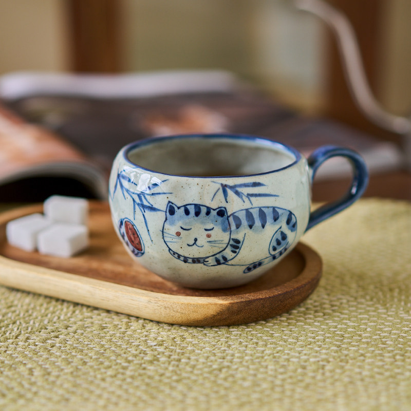 Hand-pinched stoneware mug, hand-painted with lazy cats + bamboo/flower motifs in classic blue & white. 200ml capacity—cute, cozy, and full of playful Eastern charm, perfect for coffee or tea