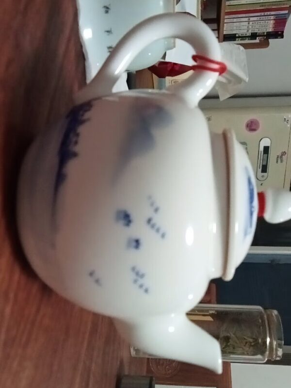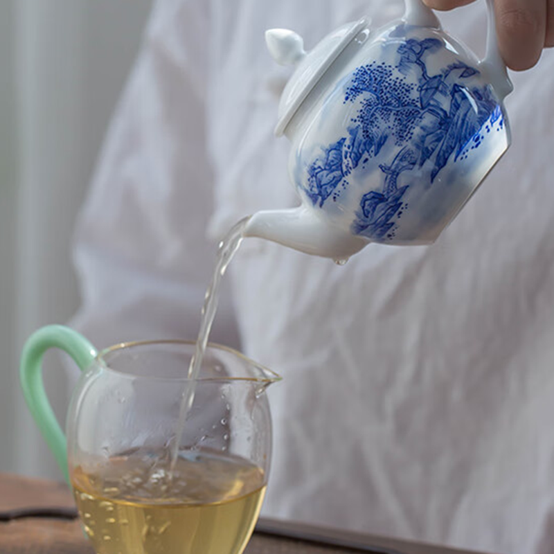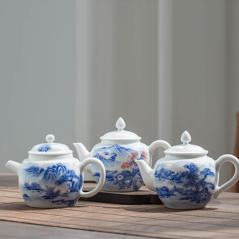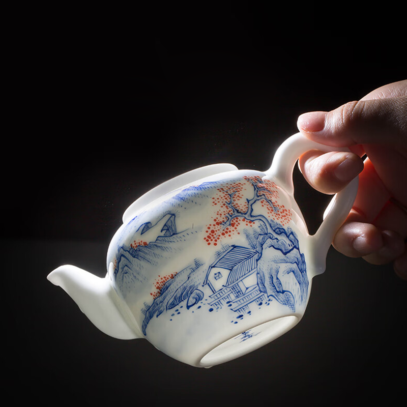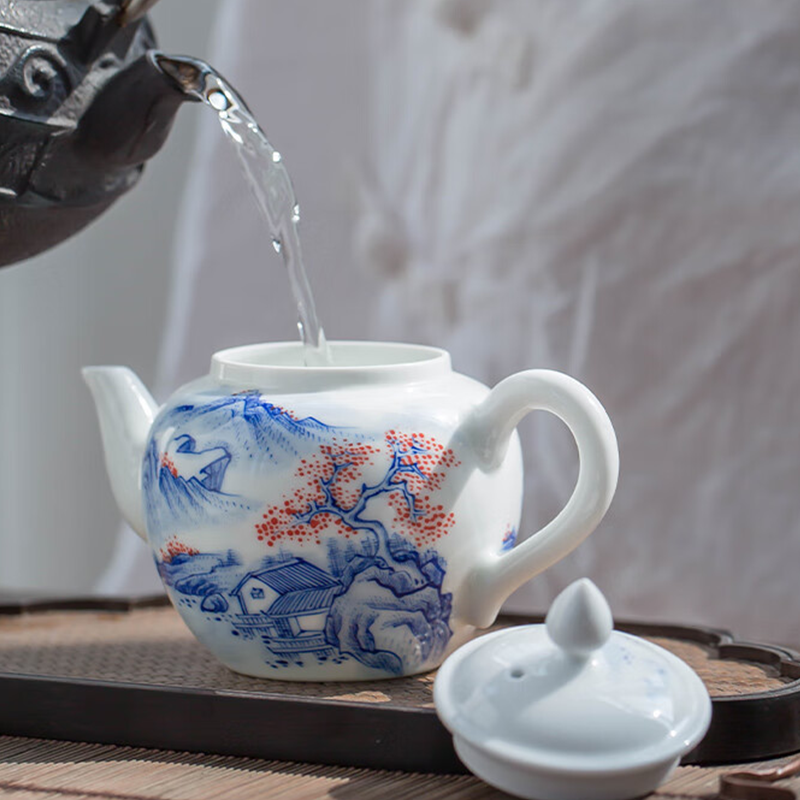 By artist Modu:I use the traditional underglaze blue technique, dipping a fine brush into mineral cobalt pigment to draw every line: the layered mountains in the distance, the gnarled branches of the red-blossom tree, the tiny cottage by the river, the stones along the bank. The red blossoms are added with a mineral red pigment, fired at high temperature to lock in the color forever. This is the same method our ancestors used during the Ming and Qing dynasties—no stencils, no shortcuts, just hand and eye, patience and practice.The shape is a classic “pear-shaped teapot,” pulled on the wheel by hand, not cast in a mold. I spend hours refining the curve of the body, the angle of the spout, the weight of the handle—so it sits comfortably in the hand, pours smoothly, and balances perfectly when filled. The lid is shaped like a water drop, a small detail that echoes the quiet flow of the river in the painting.This teapot is for the quiet moments: early mornings with a cup of green tea, afternoons spent chatting with old friends, evenings of meditation with a single cup of oolong. It’s not for loud parties or quick drinks. It’s for slowing down, for remembering the beauty of the mountains and rivers, for honoring the craft that has been passed down through generations.