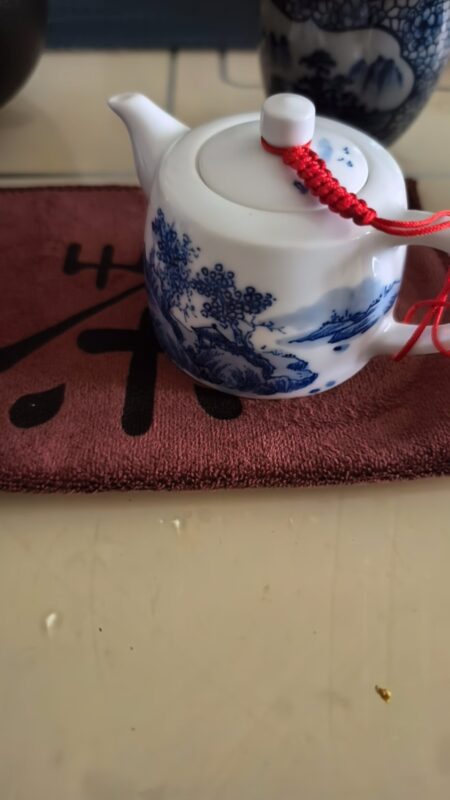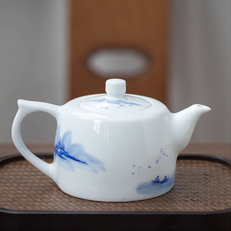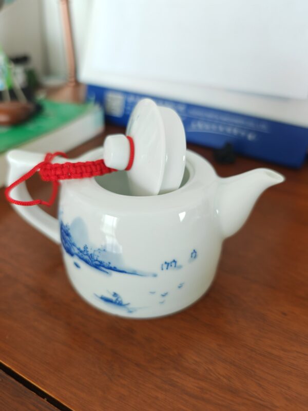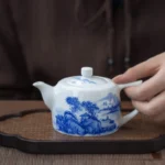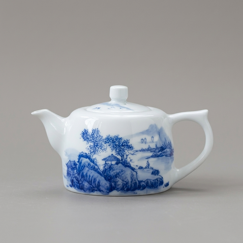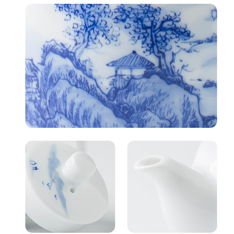 By artist Modu:it’s a classic “well-column” design, named for its sturdy, upright form like an ancient well railing. I pull every pot by hand on the wheel, refining the curve of the body, the angle of the spout, and the weight of the handle until it sits perfectly in the hand, pouring smoothly without dripping. The clay is high-white Gaoling clay, refined and kneaded for days to create a translucent, luminous body that glows softly when held to light. Every line of the serene mountain pavilion landscape is hand-painted with traditional underglaze blue technique, fired at 1300℃ for permanent, fade-proof color. Made from premium high-white kaolin clay, the well-column shape delivers a smooth, drip-free pour, perfect for mindful gongfu tea sessions, solo zen sipping, or as a meaningful gift for tea lovers.