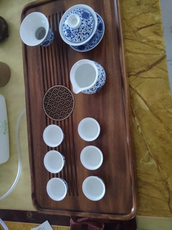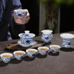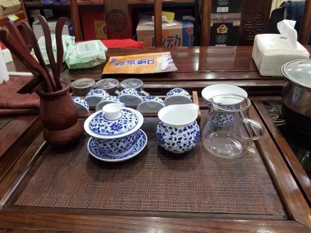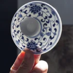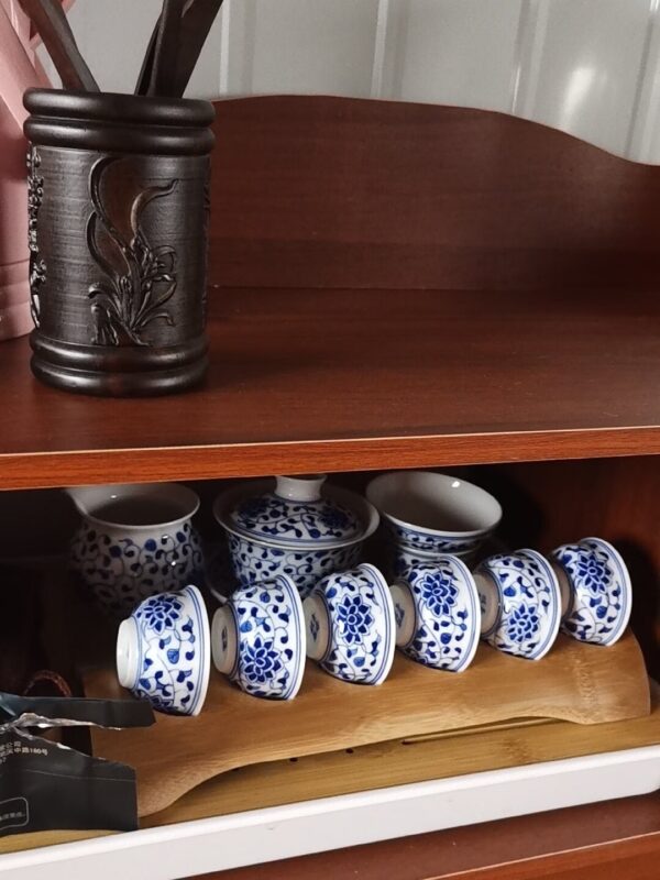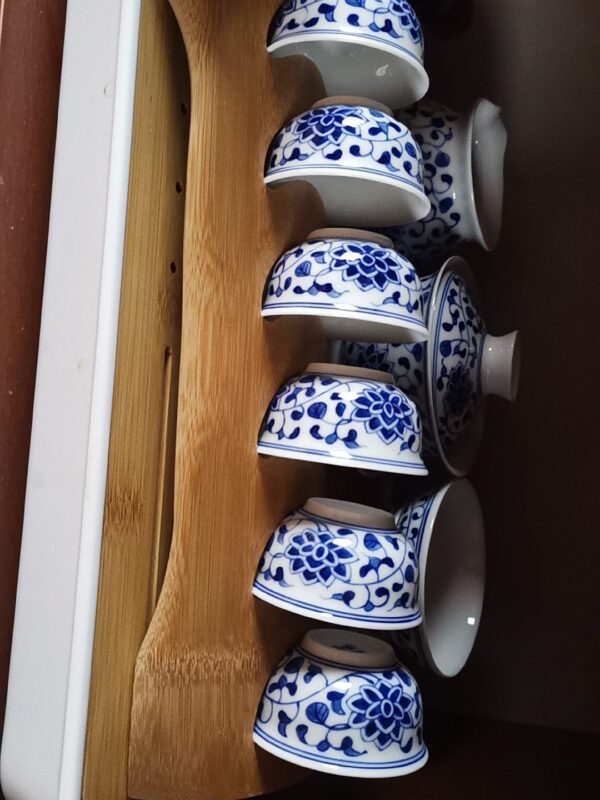 By artist Modu:It is a complete gongfu tea ceremony set, designed to cover every step of the traditional tea ritual. The gaiwan (lidded bowl) is for brewing and smelling the tea’s aroma; the teapot is for sharing; the fairness pitcher ensures every cup gets the same strength of tea; the strainer filters out tea leaves; and the 6 small tasting cups are for savoring the tea’s flavor. Every piece is shaped by hand on the wheel, refined to the perfect balance of practicality and elegance. The clay is premium high-white kaolin, refined for days to create a smooth, luminous body that glows softly when held to the light, thin yet sturdy, warm in the hand with every sip.every piece is hand-painted with the classic interlocking lotus motif, a symbol of “step-by-step growth” and “continuous good fortune” in Chinese culture. The lotus, growing from mud yet blooming spotless, represents purity and nobility; the interlocking vines symbolize endless vitality and prosperity. Every petal, every vine, every line is painted freehand with a fine brush dipped in mineral cobalt pigment.