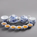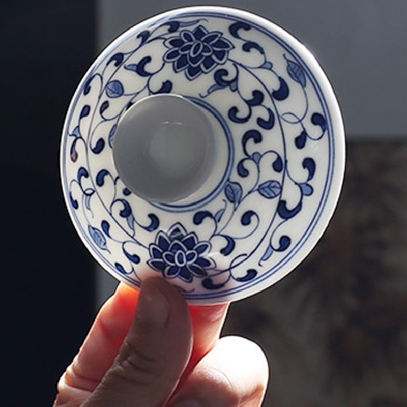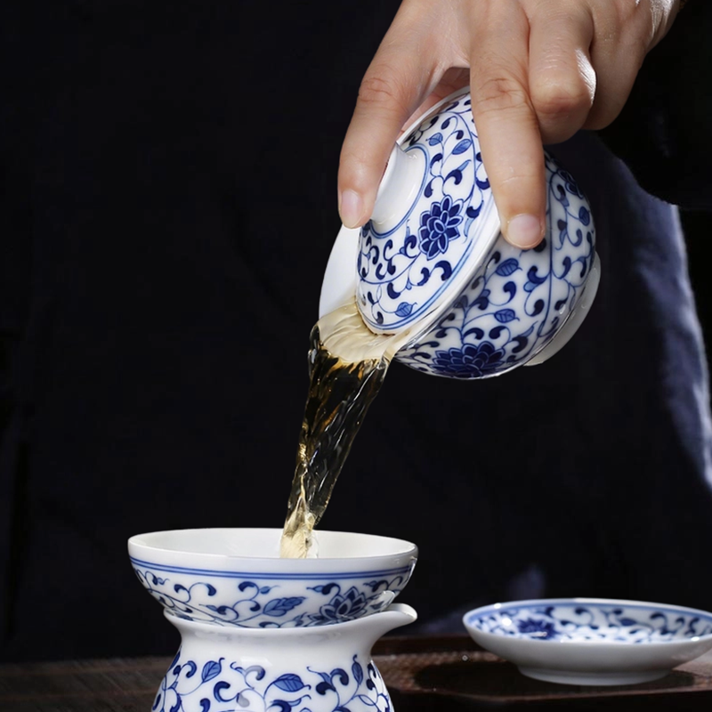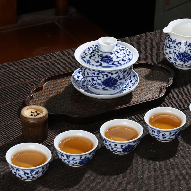 A complete 10-piece gongfu tea set from Jingdezhen, hand-painted with the classic interlocking lotus motif in traditional underglaze blue technique. Includes a gaiwan(Diameter: 9.7 cm;Height: 8.4 cm;Capacity: 170 mL), teapot, fairness pitcher(Diameter: 7.7cm;Height: 7cm;Capacity: 180 mL), strainer(Diameter: 8.8cm;Height: 5.6cm), and 6 tasting cups(Diameter: 5.9cm;Height: 3.1cm;Capacity: 30 mL). Made from premium high-white kaolin clay, it’s ideal for full gongfu tea ceremonies, family gatherings, or as a luxurious cultural gift for tea lovers.