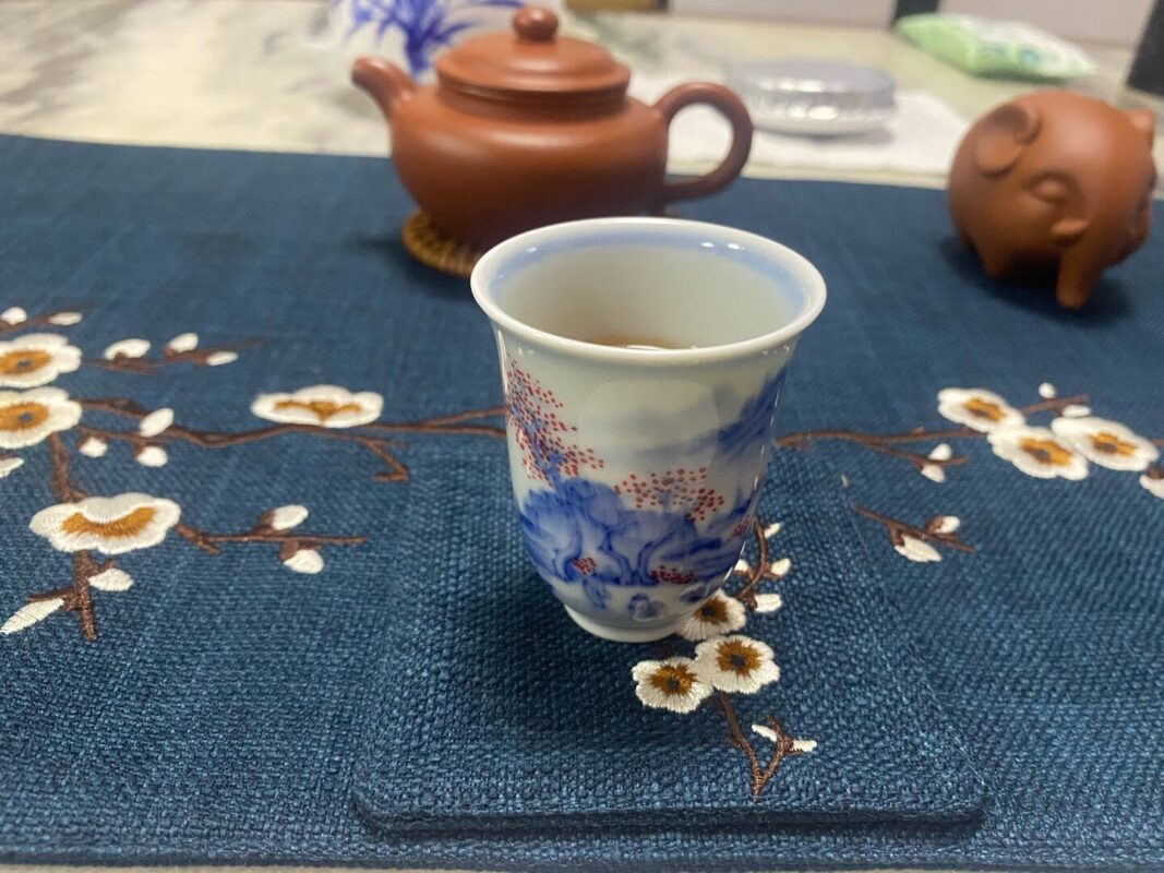 By artist Modu:I use the traditional underglaze blue and red technique, a craft passed down from the imperial kilns of the Ming and Qing dynasties. Every line of the misty mountains, every gnarled branch of the maple tree, every dot of red on the maple leaves, is painted freehand with a fine brush, using mineral cobalt and copper pigments. The scene is named “Curtain Rolls Over Stream Maple”, a poetic vision of autumn mountains by a stream, where the wind lifts the maple leaves like a rolling curtain. It is a scene of quiet serenity, a reminder to slow down, breathe in the aroma of the tea, and find peace in the small moments. Fired at over 1300℃, the pigments fuse permanently with the clear glaze, so the colors will never fade, chip, or leach—safe, durable, and beautiful for a lifetime of tea ceremonies.