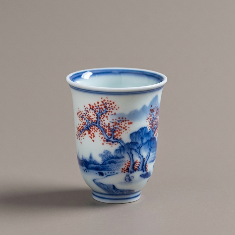 A 50ml handcrafted aroma cup from Jingdezhen, hand-painted with the serene “Curtain Rolls Over Stream Maple” landscape, featuring misty blue mountains and vivid red maple trees in traditional underglaze blue & red technique. The tall, slender shape locks in tea aroma perfectly, ideal for gongfu tea ceremony aroma appreciation, solo tea sipping, or as a refined gift for tea connoisseurs.