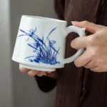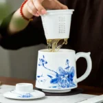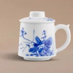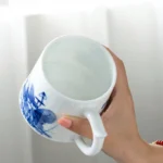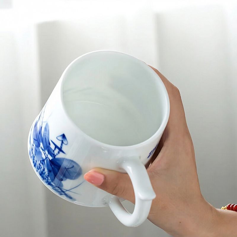 Hand-painted by Jingdezhen artisans with blue and white lotus and fish patterns, this mug comes with a ceramic infuser and lid. Made of translucent high-white porcelain, it’s perfect for easy tea brewing at home or the office, blending practicality with Eastern elegance.