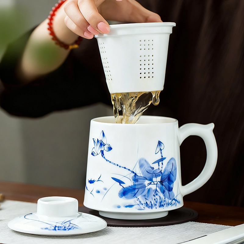 Hand-Painted Blue & White Tea Mug with Infuser, Jingdezhen Lotus & Fish Pattern