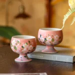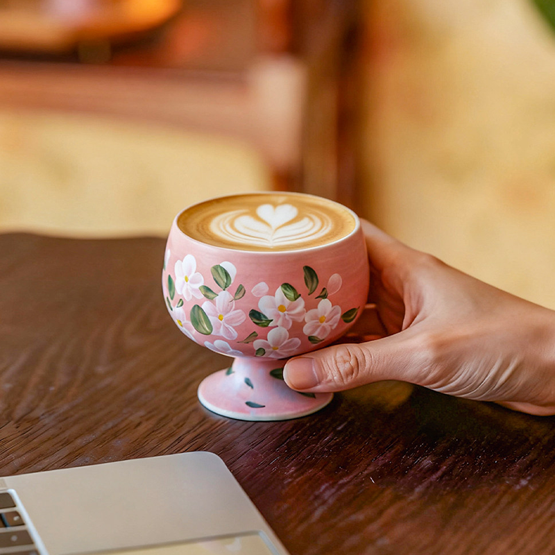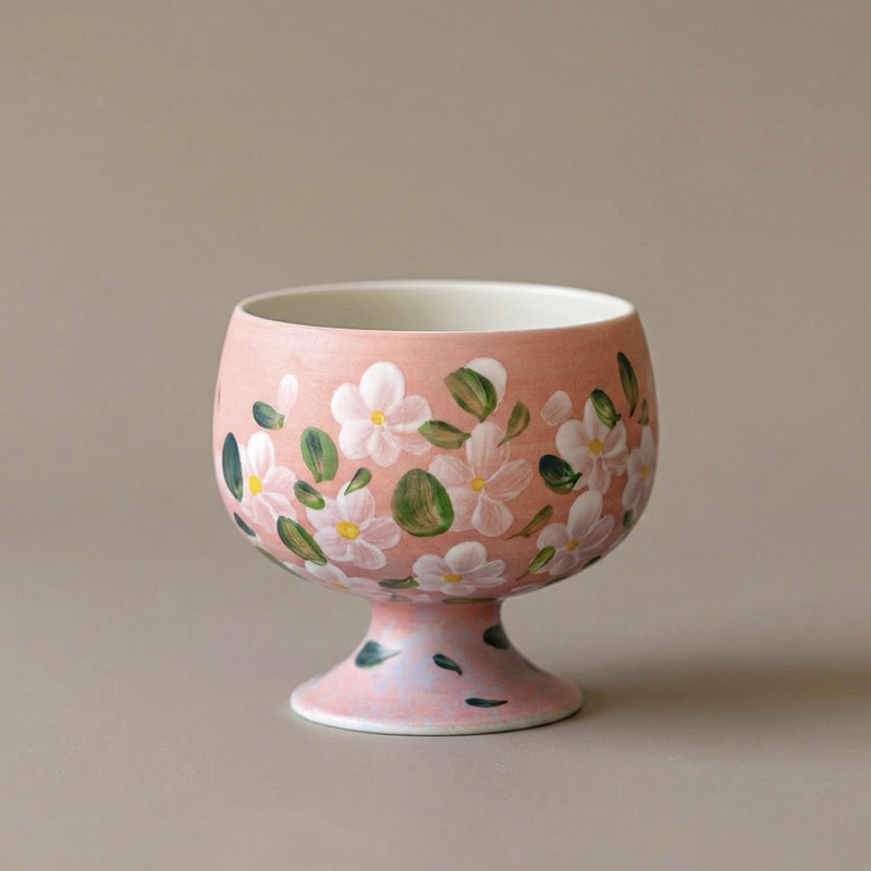 Elegant blush base with 100% hand-painted florals, stemmed shape + gradient glaze, 200ml capacity.