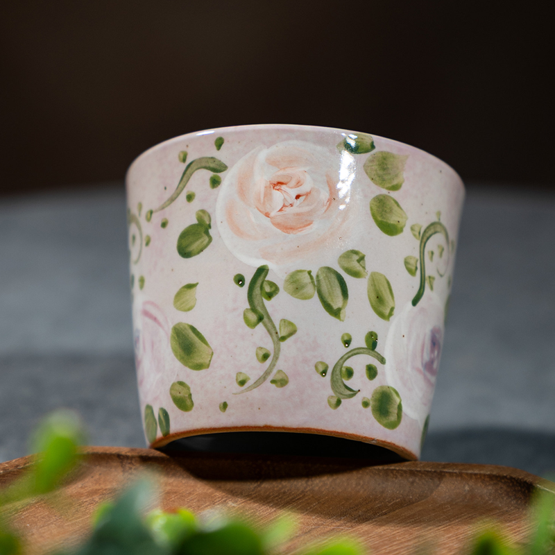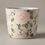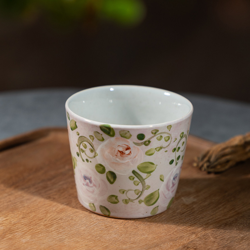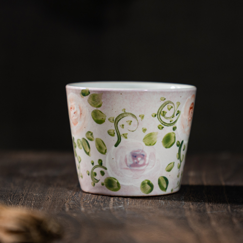 Blush-toned stoneware base, hand-painted blush roses and vines via high-fire underglaze technique. 200ml capacity, warm texture ideal for coffee and tea—gentle, cozy vintage charm.