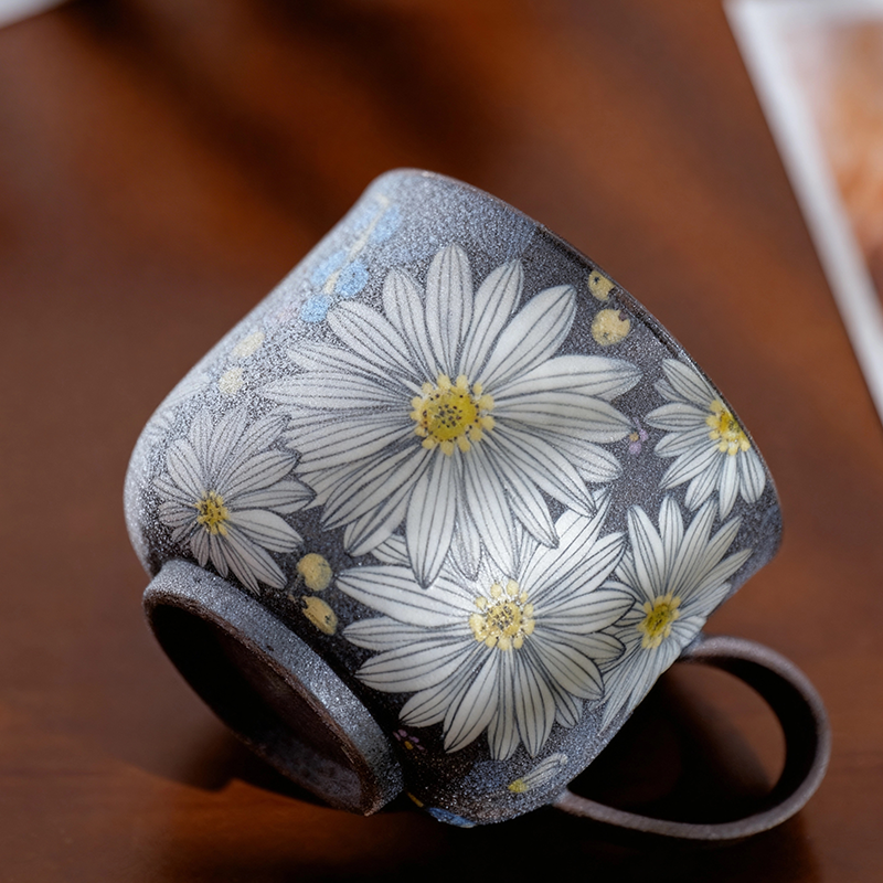 Raw mineral purple clay body with clear glazed interior for easy cleaning. Hand-painted daisies via high-fire under-glaze technique. 310ml capacity ideal for coffee and tea—restrained yet bright vintage autumn texture.