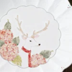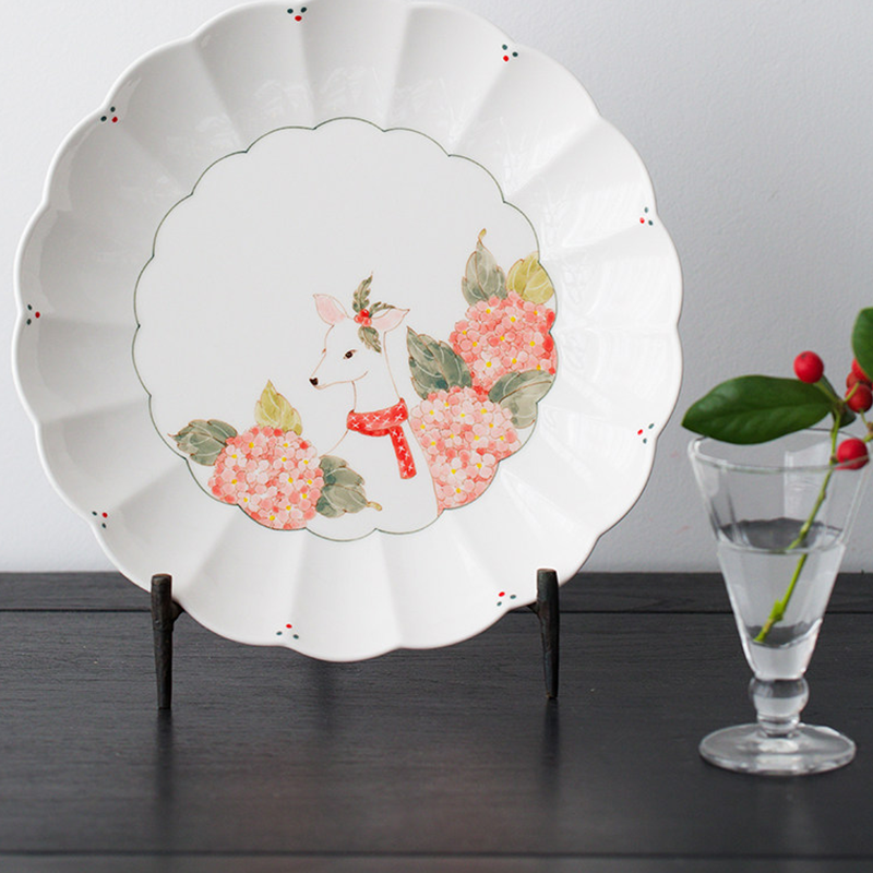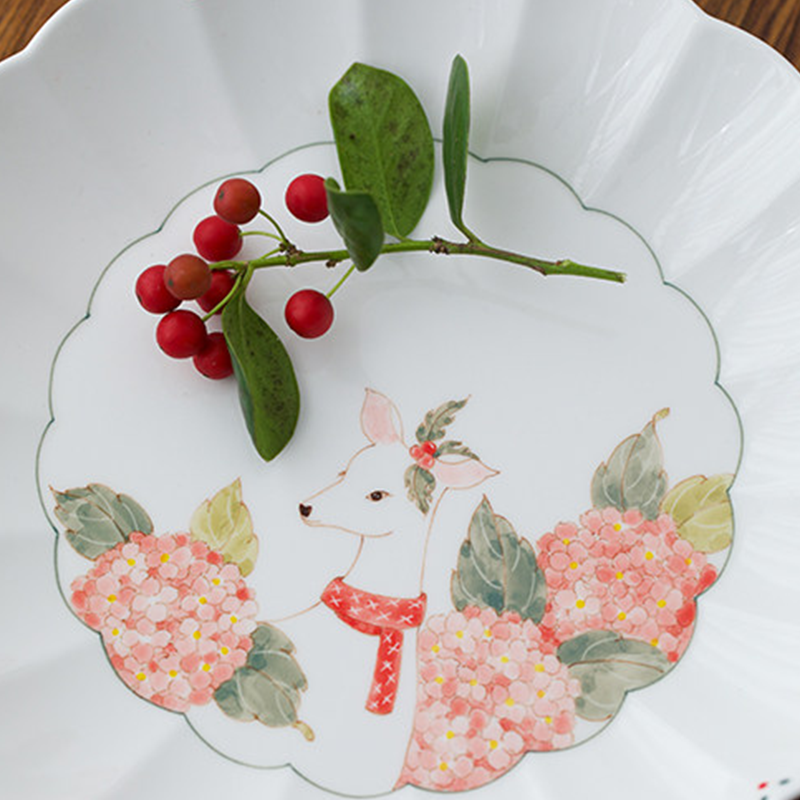 A scalloped ceramic plate with hand-painted deer and hydrangea motifs. The soft pink blooms and cozy red scarf bring warm festive charm—microwave, dishwasher, and sterilizer safe, perfect for winter meals and gift-giving.