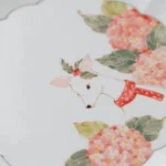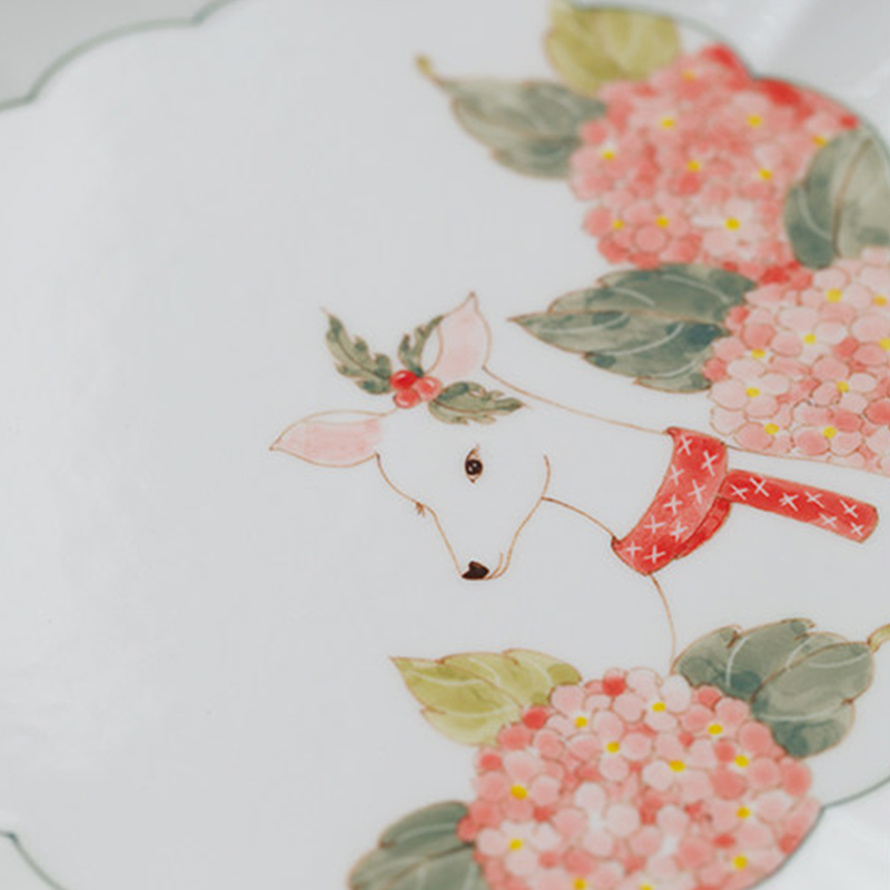 The scalloped edge is pressed by hand, each ridge like a petal unfurling, catching light to make the plate feel alive. At its heart, a deer with delicate antlers leans into clusters of pink hydrangeas, his red scarf a bright spot of warmth against the white ceramic. I painted each hydrangea petal one by one, layering soft pinks and greens to make them feel like they’re breathing, like they might fall gently onto your table. Tiny red and green dots dot the edge, like snowflakes or berries, a quiet nod to the season.