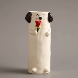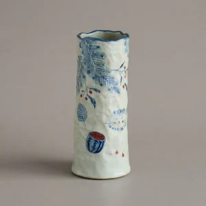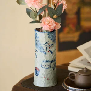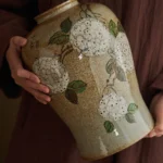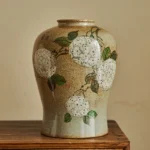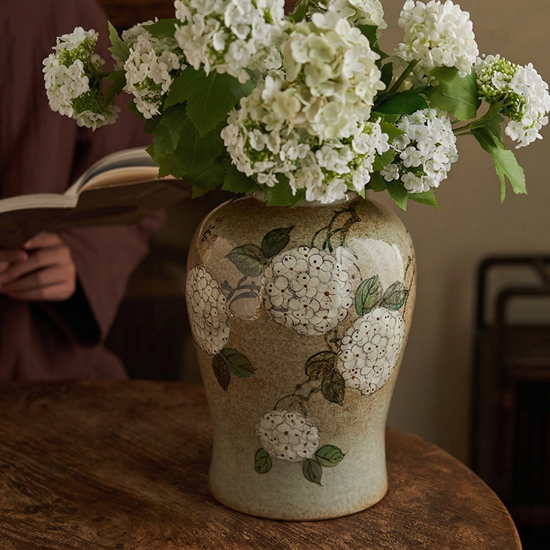 By artist Taomei:In Jingdezhen tradition, the hydrangea represents unity, gratitude, and heartfelt emotion—its clustered blooms a metaphor for family, community, and the warmth of togetherness.We painted each hydrangea cluster by hand, layering soft white petals to mimic the full, rounded shape of the bloom—echoing the ideal of “man yuan” (fullness and completeness). The earthy, speckled ceramic base grounds the delicate flowers, just as tradition grounds modern life: rough, rooted, and unapologetically alive. The classic Chinese vase shape—wide belly, narrow neck—frames the blooms like a scroll painting, turning a simple arrangement into a piece of cultural art.