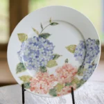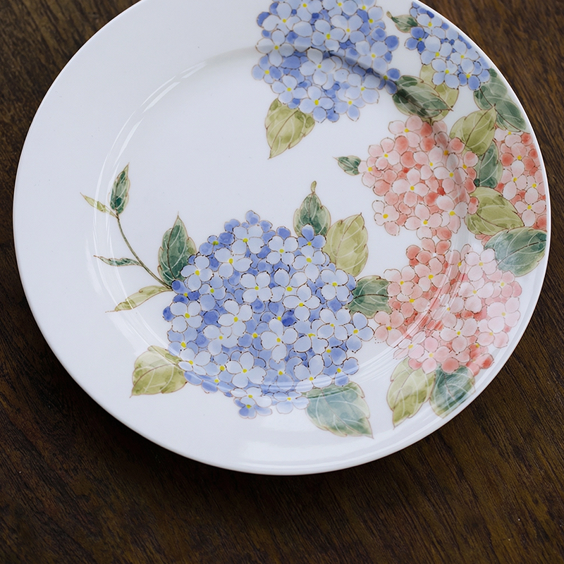 An 8-inch ceramic plate with hand-painted blue and pink hydrangea clusters, rendered in meticulous fine-line underglaze. Every petal and leaf is drawn with precision—this is my proudest work, blending delicate artistry with durable daily use (microwave, dishwasher, sterilizer safe).