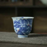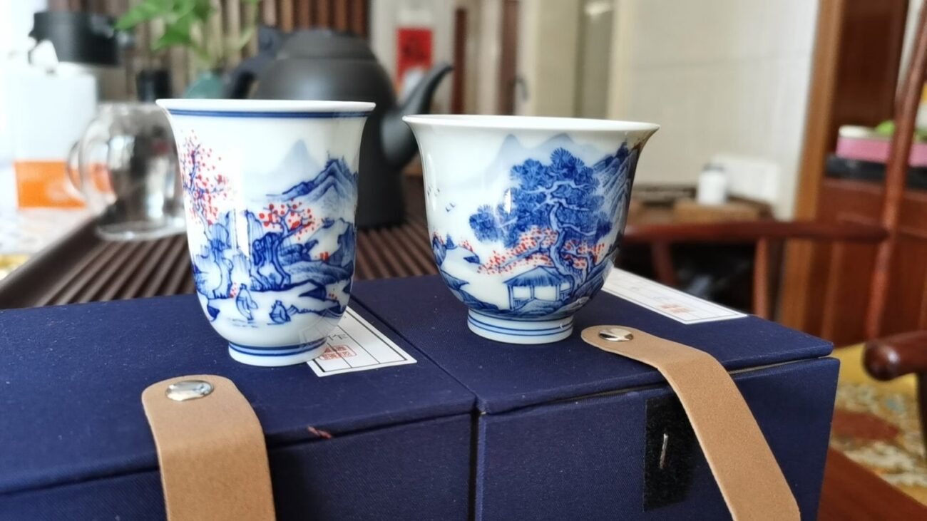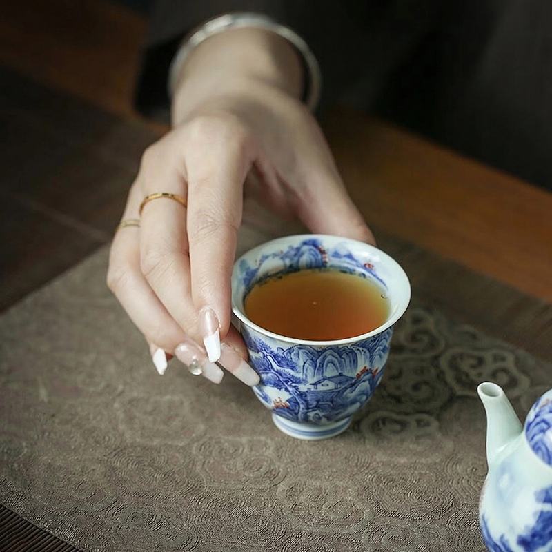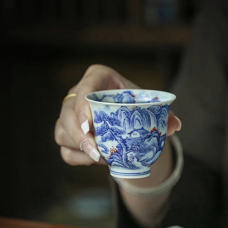 A handcrafted tea cup from Jingdezhen, with delicate blue-and-white landscape painting on both inside and outside surfaces, accented with red plum blossoms. Made from premium high-white kaolin clay, the soft, elegant shape and smooth glaze make it ideal for gongfu tea sipping, tea ceremonies, or as a refined gift for tea connoisseurs.