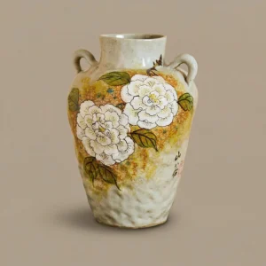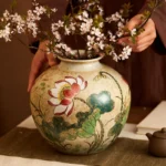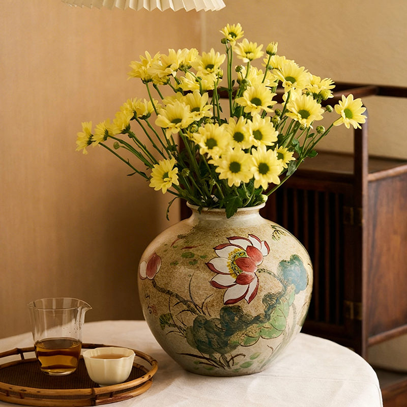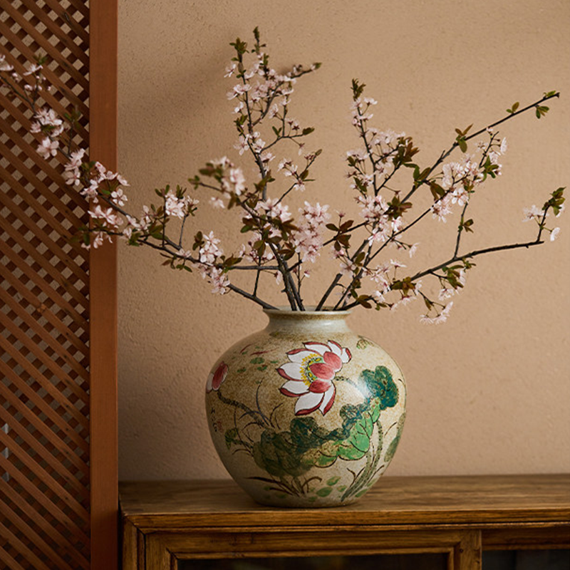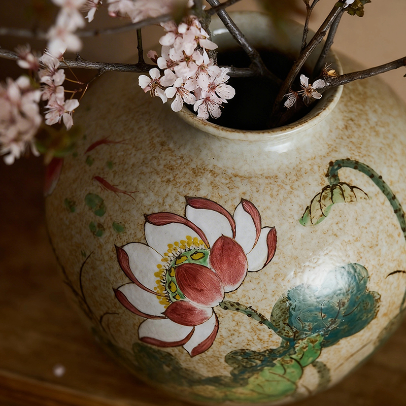 Large round-bodied rustic ceramic vase with a creamy speckled base, hand-painted with lotus blooms and leaves. Embodying the lotus’s symbolism of purity, integrity, and serene Zen, it infuses elegant Eastern beauty into your living room or tea space