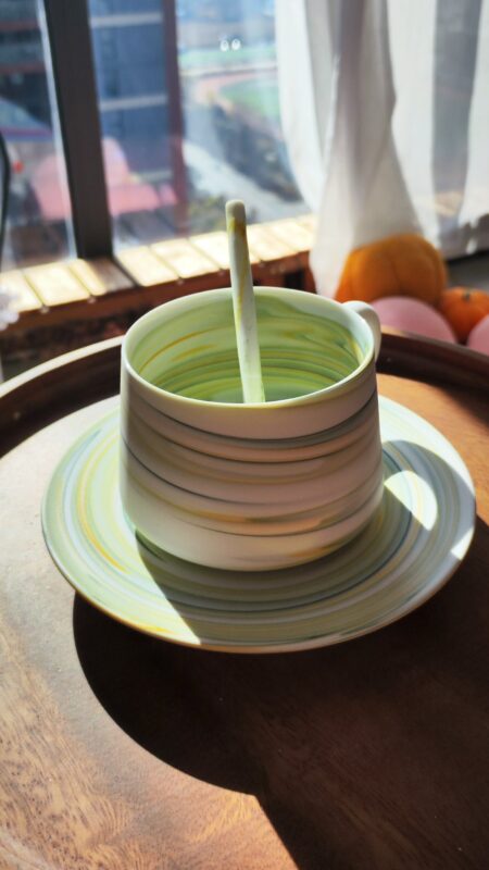 Every step, from kneading and marbling to throwing and firing, is done slowly and deliberately, letting the clay’s colors set in the fire into a flowing landscape. It is more than a drinkware set; it is my interpretation of “nature as order,” a balance between handcraft and modern life, accompanying you to savor the fluid poetry woven into clay and fire with every sip.