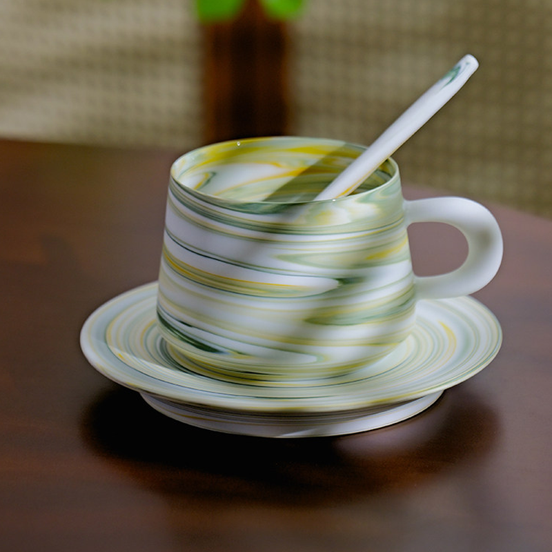 Hand-marbled ceramic with natural green, yellow, and white swirls evoking mountain streams and clouds. 300ml capacity ideal for latte art, matching saucer included—blending artistic elegance with everyday utility.