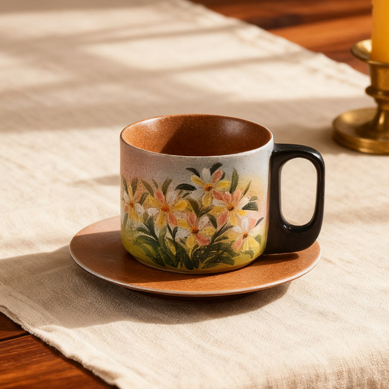 Rustic ceramic with 100% hand-painted oil-style daisies, sunset gradient base + black handle, 400ml large capacity, fresh healing handmade cup & saucer set.