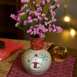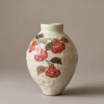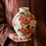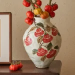 A curvy handcrafted ceramic vase with hand-painted red persimmon motifs on a textured off-white base. The persimmon symbolizes “good things in succession” and abundant blessings, bringing warm, rustic charm to your living room, dining table, or office