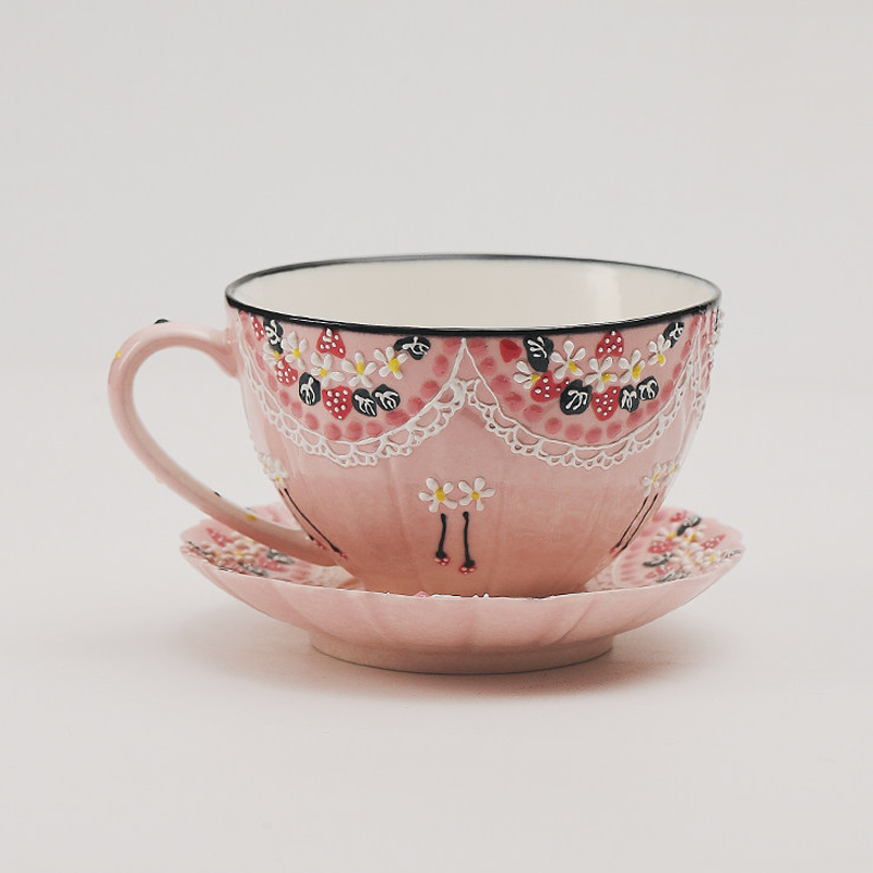 By artist Kai:Hi there! I’m the Jingdezhen maker behind this little cup! When I designed it, I was totally obsessed with the idea of a “French garden afternoon tea”—so I picked this soft, dreamy sakura pink as the base, then hand-painted lace trim, tiny strawberries, and daisies all over it, like dressing the cup in a gentle little dress~