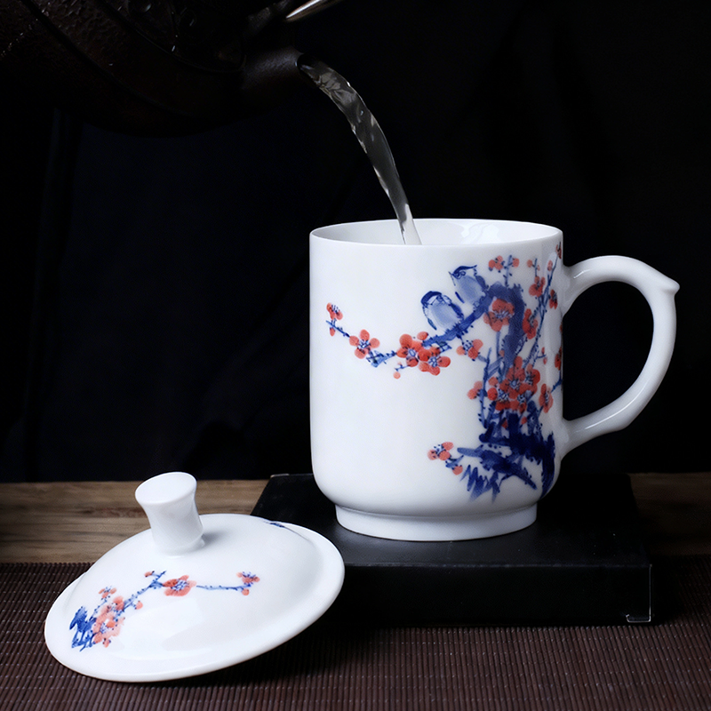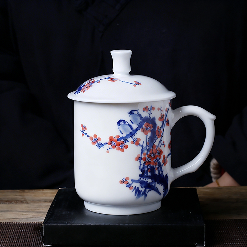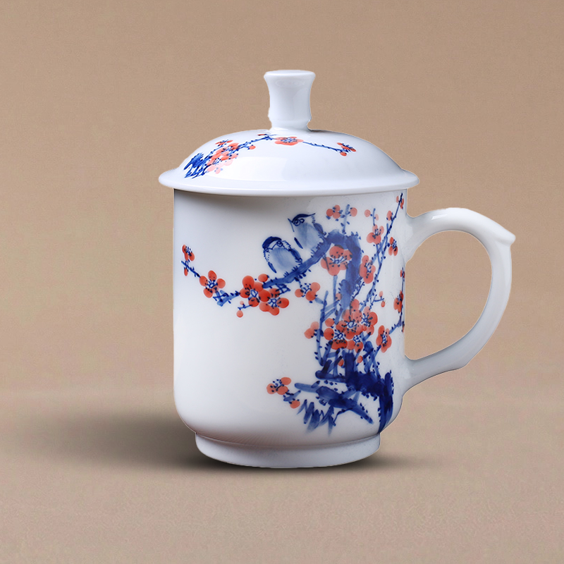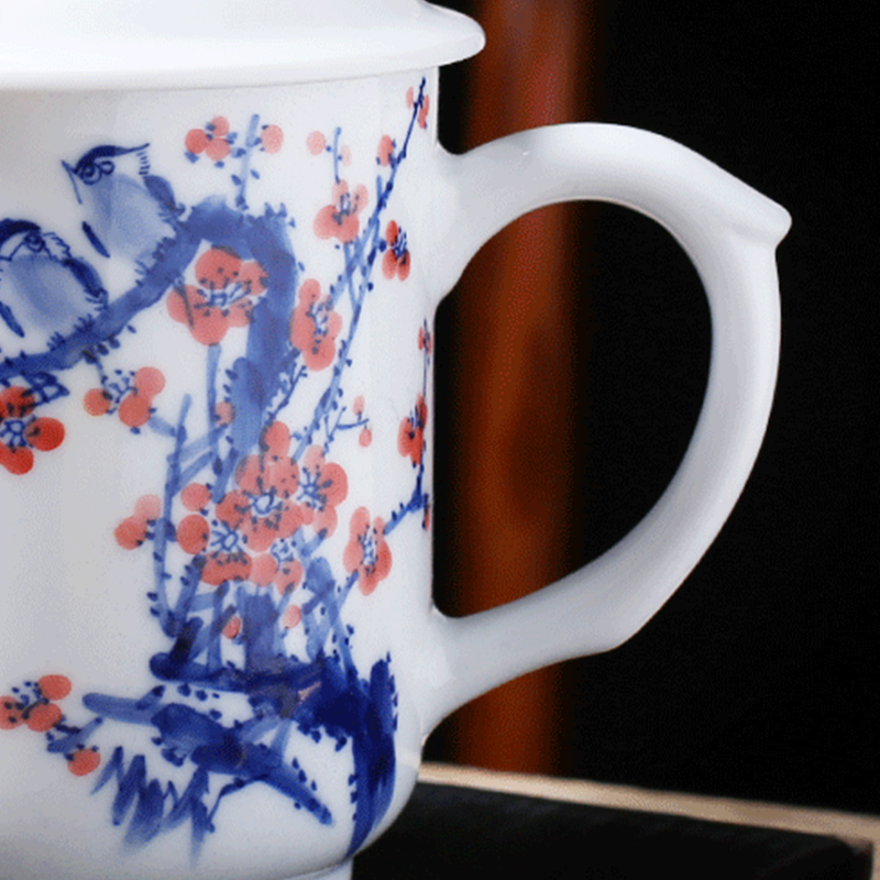 Then the painting: I use the traditional underglaze blue technique, dipping a fine brush into cobalt mineral pigment to draw the plum branches and birds. The bright red plum blossoms are added with mineral red pigment, then the whole mug is fired at over 1300°C, locking the colors forever under a clear glaze. No stencils, no shortcuts—every line, every petal, every feather is guided by hand and eye, honed over years of practice.