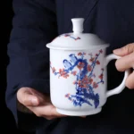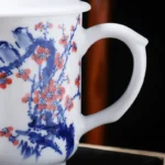 This mug features a refined Jingdezhen white porcelain body, boasting a soft, warm hue and extraordinary translucency. The exterior is hand-painted with a solitary Red Plum Blossom branch. The vigorous strokes depict resilient branches and proud blossoms, embodying a spirit of fortitude.