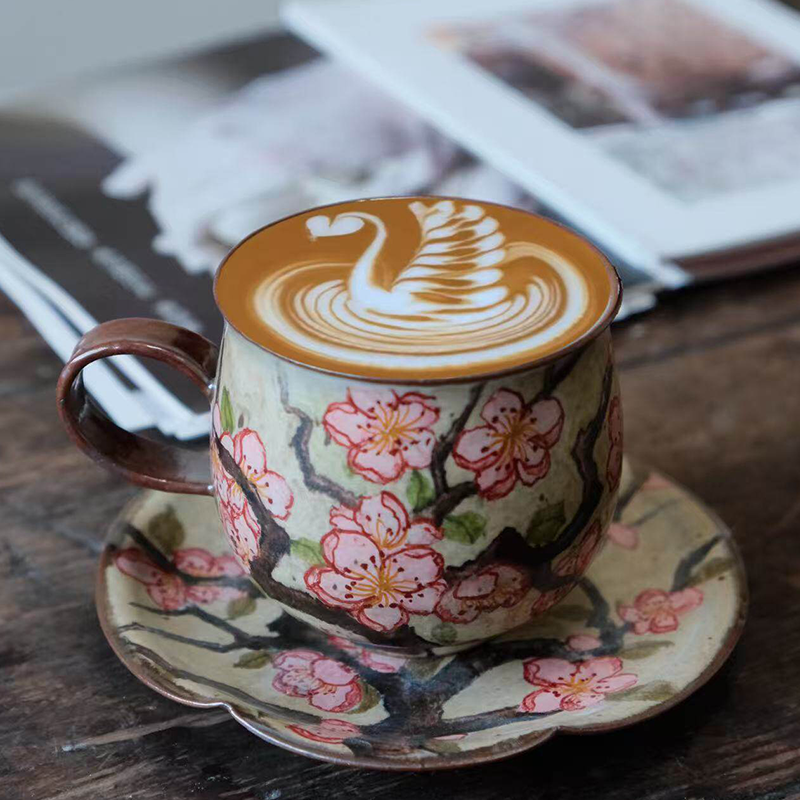 Warm beige stoneware base, hand-painted with red plum blossoms and sturdy branches. Rounded shape optimized for latte art, matching petal-edged saucer included. Heat and cold resistant—oven, microwave, freezer, and dishwasher safe—blending timeless elegance with everyday practicality.